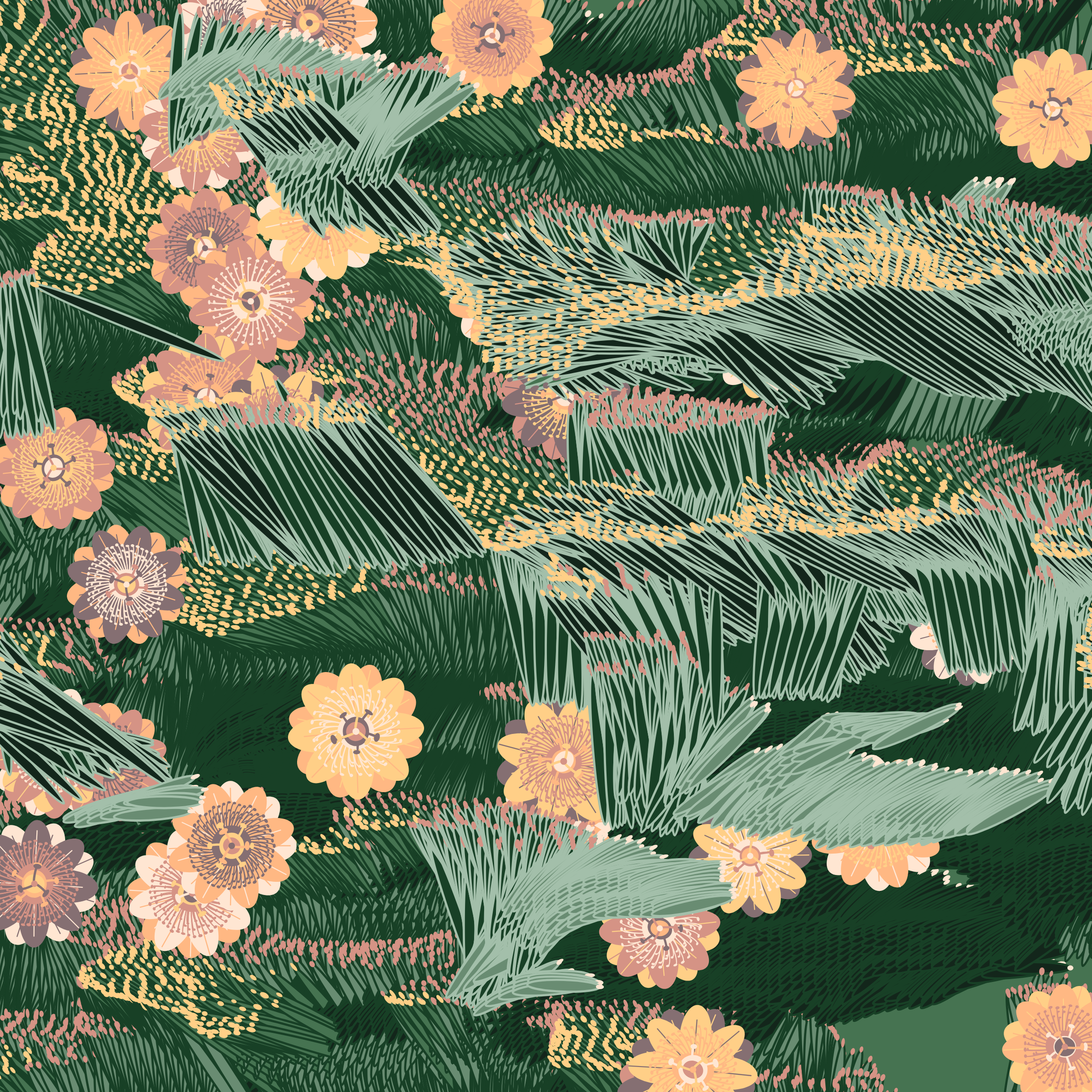 “Fragments of an infinite field” is a compositional system in which an idealized plant species is generated and arranged in a potentially infinite field of foliage. The main environmental parameter of the composition is the determination of a season of the year. The season determines the landscape’s colors and defines specific phenomena for each of them, such as rain in summer, snow in winter, petals falling in autumn, and pollen in spring. The flower has several possible variables, which can be macro aspects, affecting the entire population of the species, or micro, affecting each individual of the species differently. For example, the number of petals can be equal in all individuals or not. The number of filaments and other structures of the flower can undergo minor deviations, generating small mutations. The confusion between the figure (plant) and the background (earth, sky, other natural elements) is fascinating from a compositional point of view. The background colors are, most of the time, colors present in the figures, often breaking the boundary between them and, therefore, generating chromatic masses. In this project I also intend to research the following question: How to create parameters that resemble a living organism's growth? In this sense, the project approaches digital morphogenesis and the development of procedural organisms.
