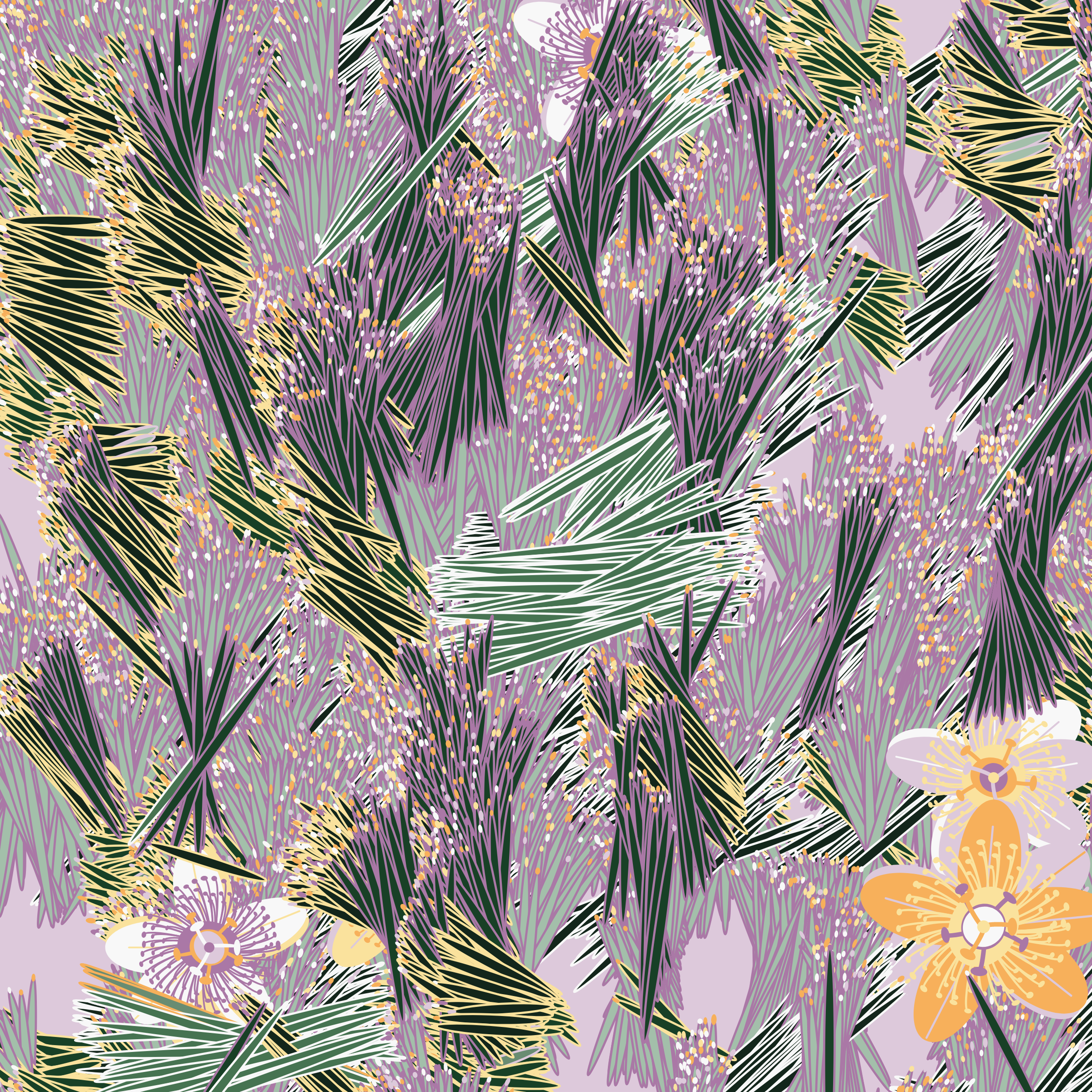 “Fragments of an infinite field” is a compositional system in which an idealized plant species is generated and arranged in a potentially infinite field of foliage. The main environmental parameter of the composition is the determination of a season of the year. The season determines the landscape’s colors and defines specific phenomena for each of them, such as rain in summer, snow in winter, petals falling in autumn, and pollen in spring. The flower has several possible variables, which can be macro aspects, affecting the entire population of the species, or micro, affecting each individual of the species differently. For example, the number of petals can be equal in all individuals or not. The number of filaments and other structures of the flower can undergo minor deviations, generating small mutations. The confusion between the figure (plant) and the background (earth, sky, other natural elements) is fascinating from a compositional point of view. The background colors are, most of the time, colors present in the figures, often breaking the boundary between them and, therefore, generating chromatic masses. In this project I also intend to research the following question: How to create parameters that resemble a living organism's growth? In this sense, the project approaches digital morphogenesis and the development of procedural organisms.