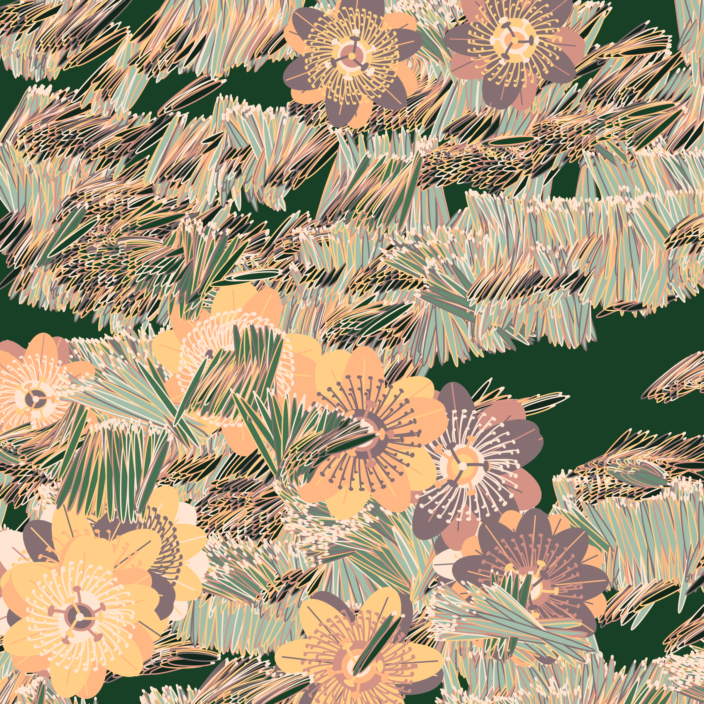“Fragments of an infinite field” is a compositional system in which an idealized plant species is generated and arranged in a potentially infinite field of foliage. The main environmental parameter of the composition is the determination of a season of the year. The season determines the landscape’s colors and defines specific phenomena for each of them, such as rain in summer, snow in winter, petals falling in autumn, and pollen in spring. The flower has several possible variables, which can be macro aspects, affecting the entire population of the species, or micro, affecting each individual of the species differently. For example, the number of petals can be equal in all individuals or not. The number of filaments and other structures of the flower can undergo minor deviations, generating small mutations. The confusion between the figure (plant) and the background (earth, sky, other natural elements) is fascinating from a compositional point of view. The background colors are, most of the time, colors present in the figures, often breaking the boundary between them and, therefore, generating chromatic masses. In this project I also intend to research the following question: How to create parameters that resemble a living organism's growth? In this sense, the project approaches digital morphogenesis and the development of procedural organisms.