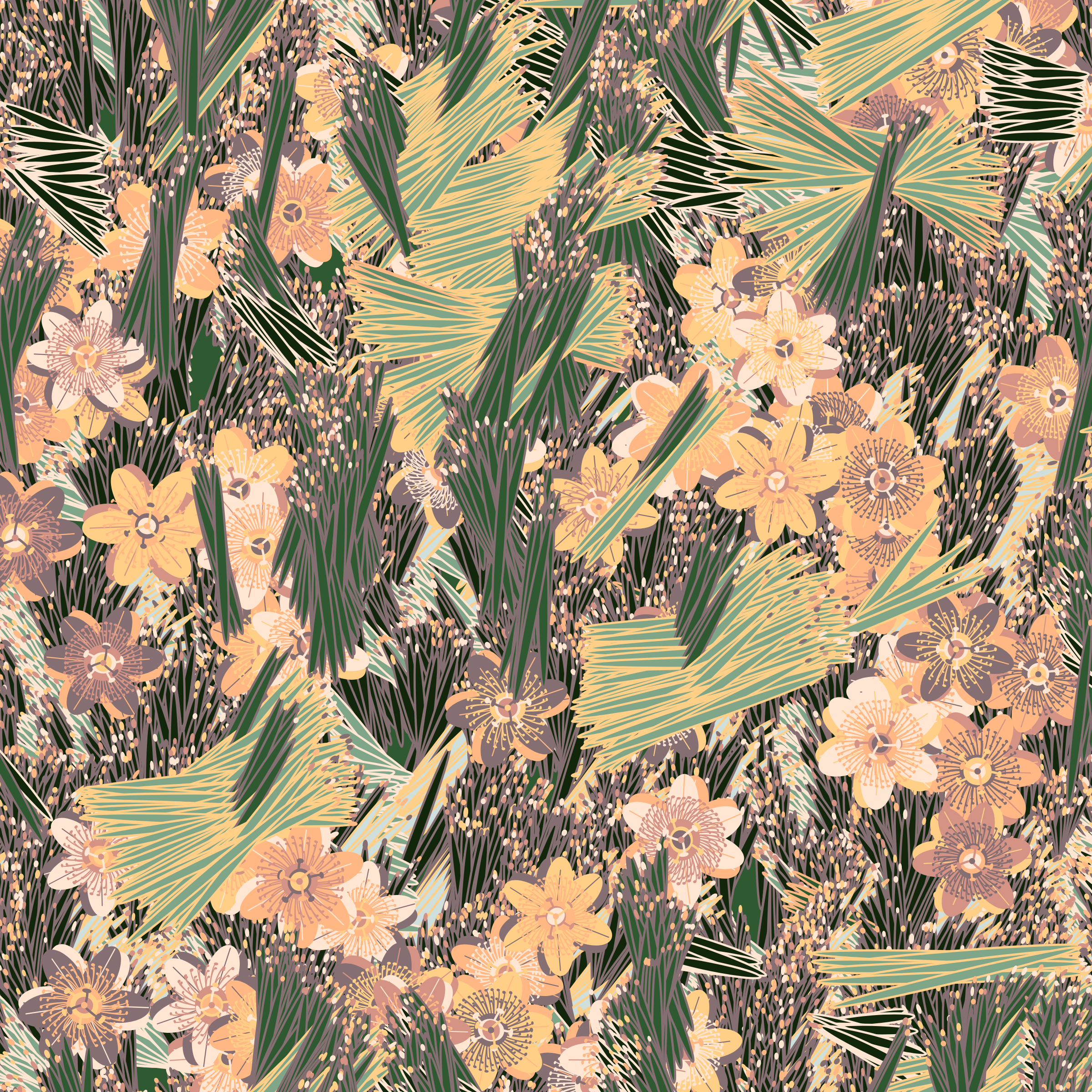 “Fragments of an infinite field” is a compositional system in which an idealized plant species is generated and arranged in a potentially infinite field of foliage. The main environmental parameter of the composition is the determination of a season of the year. The season determines the landscape’s colors and defines specific phenomena for each of them, such as rain in summer, snow in winter, petals falling in autumn, and pollen in spring. The flower has several possible variables, which can be macro aspects, affecting the entire population of the species, or micro, affecting each individual of the species differently. For example, the number of petals can be equal in all individuals or not. The number of filaments and other structures of the flower can undergo minor deviations, generating small mutations. The confusion between the figure (plant) and the background (earth, sky, other natural elements) is fascinating from a compositional point of view. The background colors are, most of the time, colors present in the figures, often breaking the boundary between them and, therefore, generating chromatic masses. In this project I also intend to research the following question: How to create parameters that resemble a living organism's growth? In this sense, the project approaches digital morphogenesis and the development of procedural organisms.