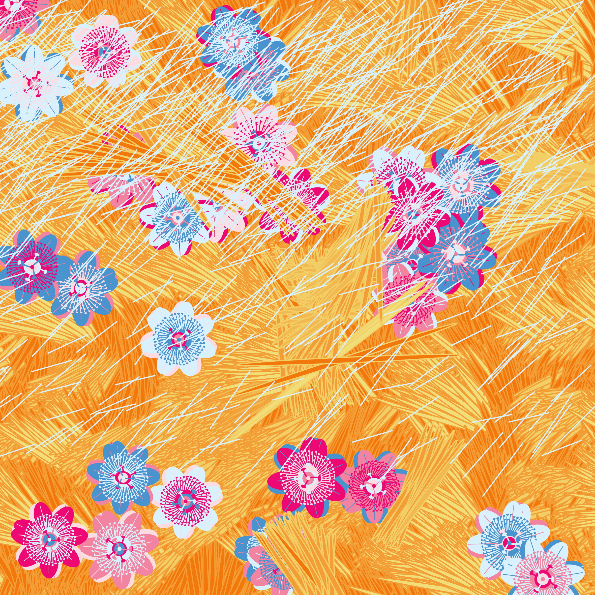 “Fragments of an infinite field” is a compositional system in which an idealized plant species is generated and arranged in a potentially infinite field of foliage. The main environmental parameter of the composition is the determination of a season of the year. The season determines the landscape’s colors and defines specific phenomena for each of them, such as rain in summer, snow in winter, petals falling in autumn, and pollen in spring. The flower has several possible variables, which can be macro aspects, affecting the entire population of the species, or micro, affecting each individual of the species differently. For example, the number of petals can be equal in all individuals or not. The number of filaments and other structures of the flower can undergo minor deviations, generating small mutations. The confusion between the figure (plant) and the background (earth, sky, other natural elements) is fascinating from a compositional point of view. The background colors are, most of the time, colors present in the figures, often breaking the boundary between them and, therefore, generating chromatic masses. In this project I also intend to research the following question: How to create parameters that resemble a living organism's growth? In this sense, the project approaches digital morphogenesis and the development of procedural organisms.