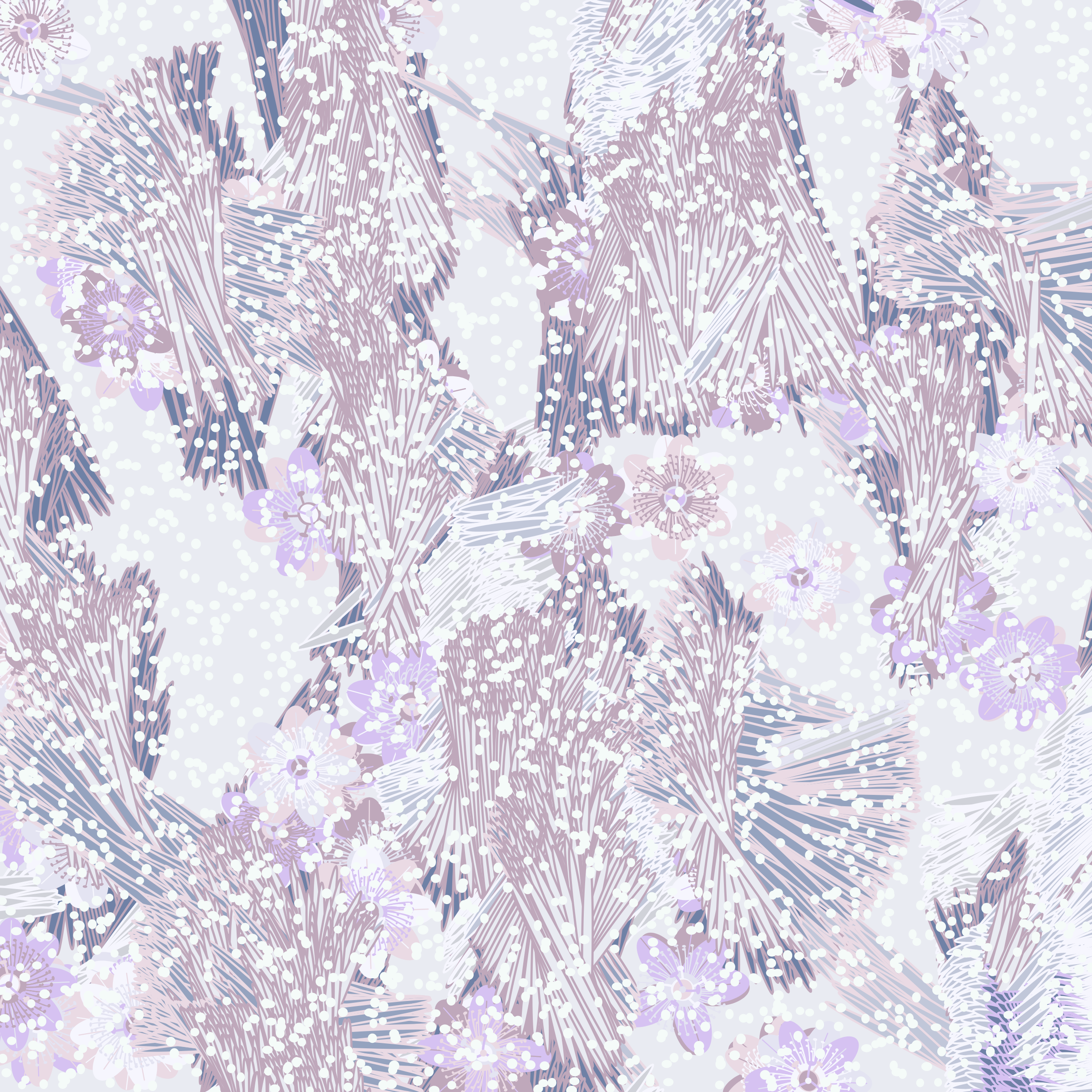 “Fragments of an infinite field” is a compositional system in which an idealized plant species is generated and arranged in a potentially infinite field of foliage. The main environmental parameter of the composition is the determination of a season of the year. The season determines the landscape’s colors and defines specific phenomena for each of them, such as rain in summer, snow in winter, petals falling in autumn, and pollen in spring. The flower has several possible variables, which can be macro aspects, affecting the entire population of the species, or micro, affecting each individual of the species differently. For example, the number of petals can be equal in all individuals or not. The number of filaments and other structures of the flower can undergo minor deviations, generating small mutations. The confusion between the figure (plant) and the background (earth, sky, other natural elements) is fascinating from a compositional point of view. The background colors are, most of the time, colors present in the figures, often breaking the boundary between them and, therefore, generating chromatic masses. In this project I also intend to research the following question: How to create parameters that resemble a living organism's growth? In this sense, the project approaches digital morphogenesis and the development of procedural organisms.