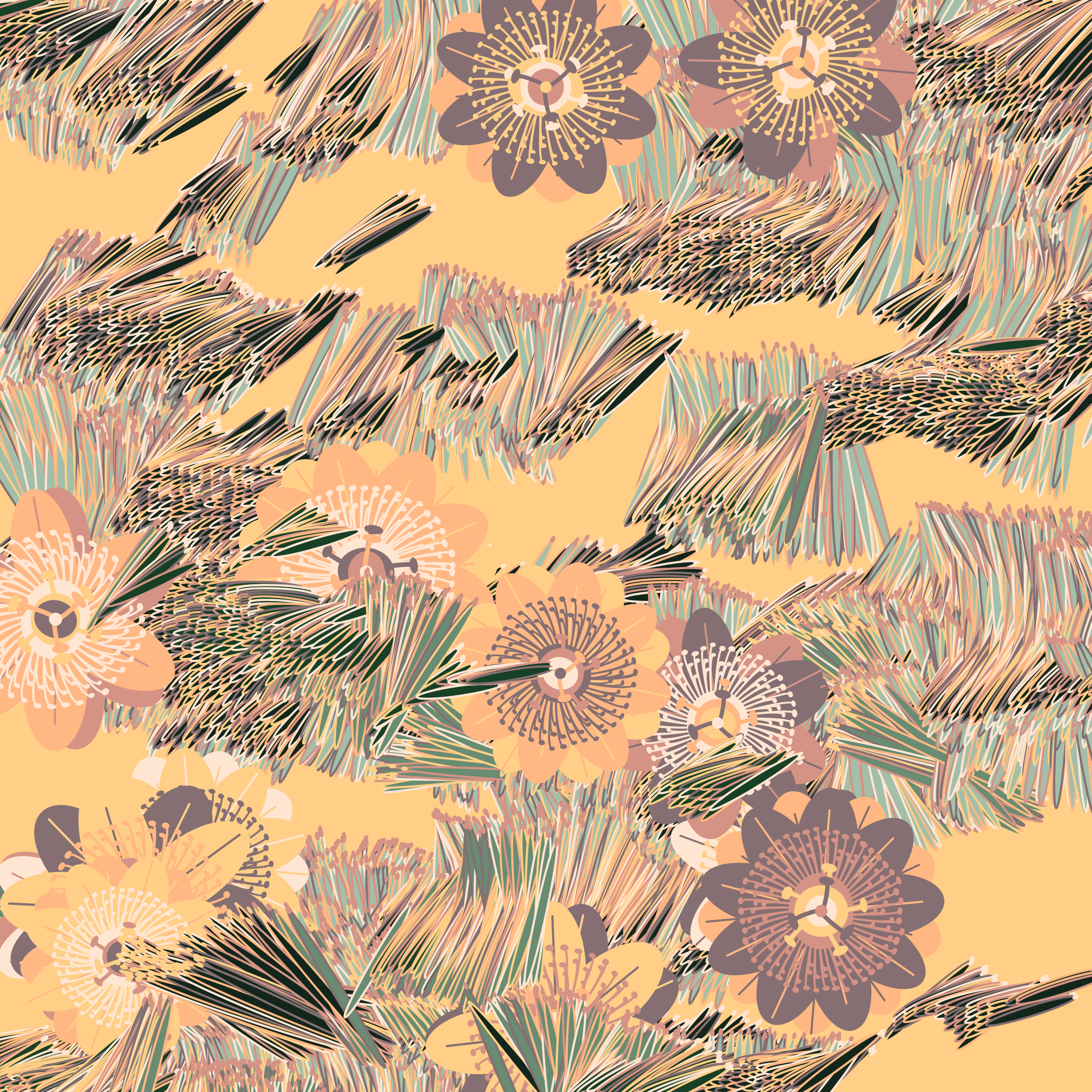 “Fragments of an infinite field” is a compositional system in which an idealized plant species is generated and arranged in a potentially infinite field of foliage. The main environmental parameter of the composition is the determination of a season of the year. The season determines the landscape’s colors and defines specific phenomena for each of them, such as rain in summer, snow in winter, petals falling in autumn, and pollen in spring. The flower has several possible variables, which can be macro aspects, affecting the entire population of the species, or micro, affecting each individual of the species differently. For example, the number of petals can be equal in all individuals or not. The number of filaments and other structures of the flower can undergo minor deviations, generating small mutations. The confusion between the figure (plant) and the background (earth, sky, other natural elements) is fascinating from a compositional point of view. The background colors are, most of the time, colors present in the figures, often breaking the boundary between them and, therefore, generating chromatic masses. In this project I also intend to research the following question: How to create parameters that resemble a living organism's growth? In this sense, the project approaches digital morphogenesis and the development of procedural organisms.