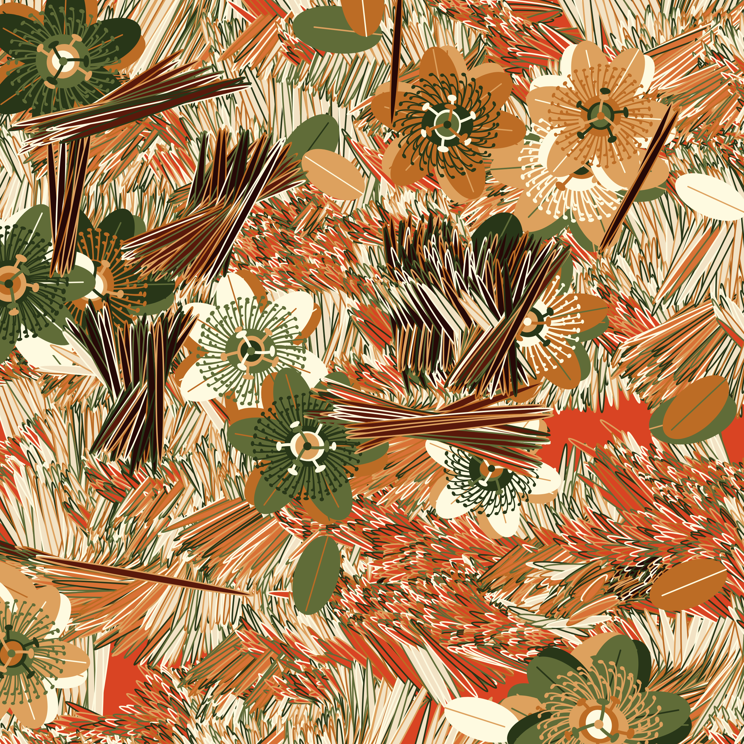 “Fragments of an infinite field” is a compositional system in which an idealized plant species is generated and arranged in a potentially infinite field of foliage. The main environmental parameter of the composition is the determination of a season of the year. The season determines the landscape’s colors and defines specific phenomena for each of them, such as rain in summer, snow in winter, petals falling in autumn, and pollen in spring. The flower has several possible variables, which can be macro aspects, affecting the entire population of the species, or micro, affecting each individual of the species differently. For example, the number of petals can be equal in all individuals or not. The number of filaments and other structures of the flower can undergo minor deviations, generating small mutations. The confusion between the figure (plant) and the background (earth, sky, other natural elements) is fascinating from a compositional point of view. The background colors are, most of the time, colors present in the figures, often breaking the boundary between them and, therefore, generating chromatic masses. In this project I also intend to research the following question: How to create parameters that resemble a living organism's growth? In this sense, the project approaches digital morphogenesis and the development of procedural organisms.