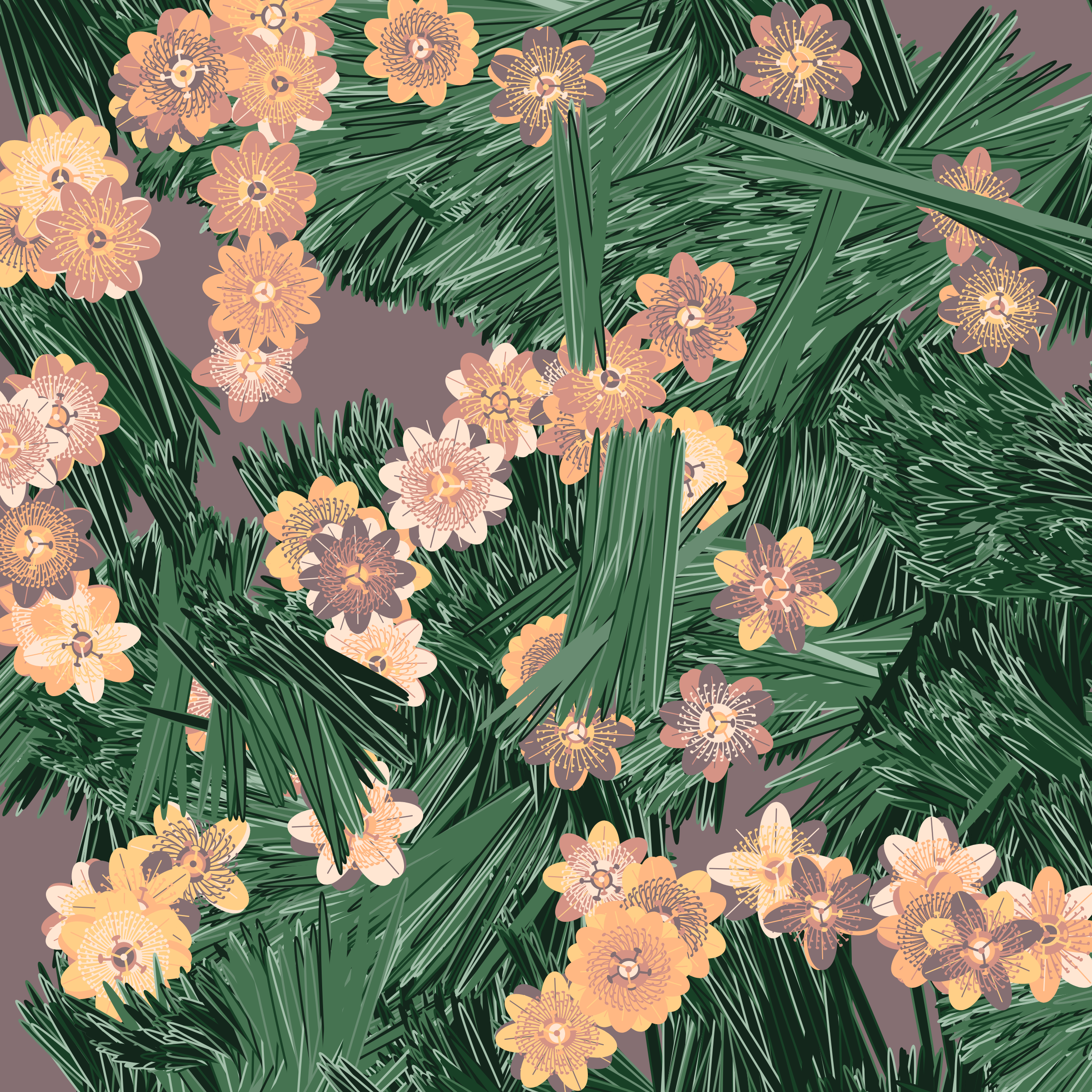 “Fragments of an infinite field” is a compositional system in which an idealized plant species is generated and arranged in a potentially infinite field of foliage. The main environmental parameter of the composition is the determination of a season of the year. The season determines the landscape’s colors and defines specific phenomena for each of them, such as rain in summer, snow in winter, petals falling in autumn, and pollen in spring. The flower has several possible variables, which can be macro aspects, affecting the entire population of the species, or micro, affecting each individual of the species differently. For example, the number of petals can be equal in all individuals or not. The number of filaments and other structures of the flower can undergo minor deviations, generating small mutations. The confusion between the figure (plant) and the background (earth, sky, other natural elements) is fascinating from a compositional point of view. The background colors are, most of the time, colors present in the figures, often breaking the boundary between them and, therefore, generating chromatic masses. In this project I also intend to research the following question: How to create parameters that resemble a living organism's growth? In this sense, the project approaches digital morphogenesis and the development of procedural organisms.