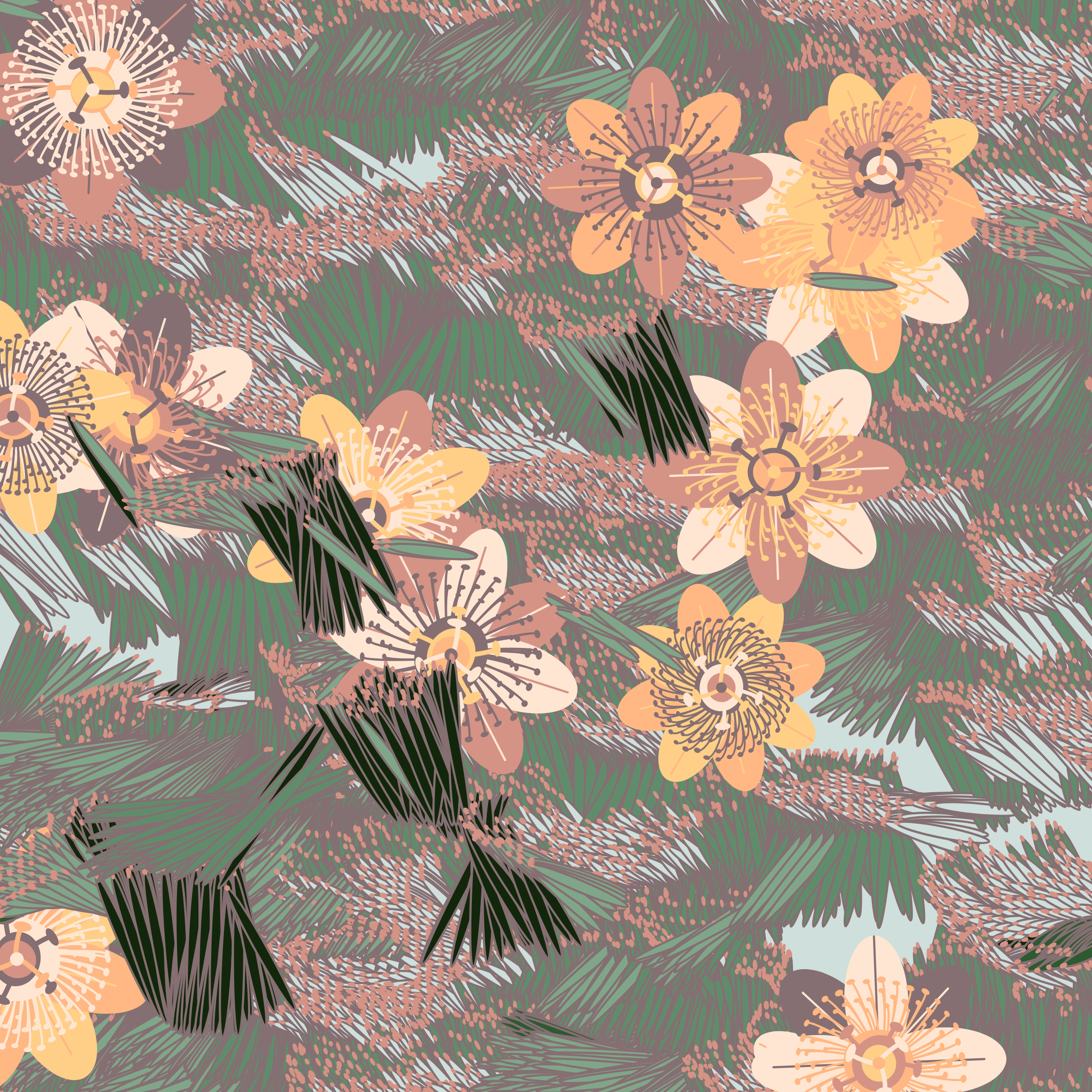 “Fragments of an infinite field” is a compositional system in which an idealized plant species is generated and arranged in a potentially infinite field of foliage. The main environmental parameter of the composition is the determination of a season of the year. The season determines the landscape’s colors and defines specific phenomena for each of them, such as rain in summer, snow in winter, petals falling in autumn, and pollen in spring. The flower has several possible variables, which can be macro aspects, affecting the entire population of the species, or micro, affecting each individual of the species differently. For example, the number of petals can be equal in all individuals or not. The number of filaments and other structures of the flower can undergo minor deviations, generating small mutations. The confusion between the figure (plant) and the background (earth, sky, other natural elements) is fascinating from a compositional point of view. The background colors are, most of the time, colors present in the figures, often breaking the boundary between them and, therefore, generating chromatic masses. In this project I also intend to research the following question: How to create parameters that resemble a living organism's growth? In this sense, the project approaches digital morphogenesis and the development of procedural organisms.