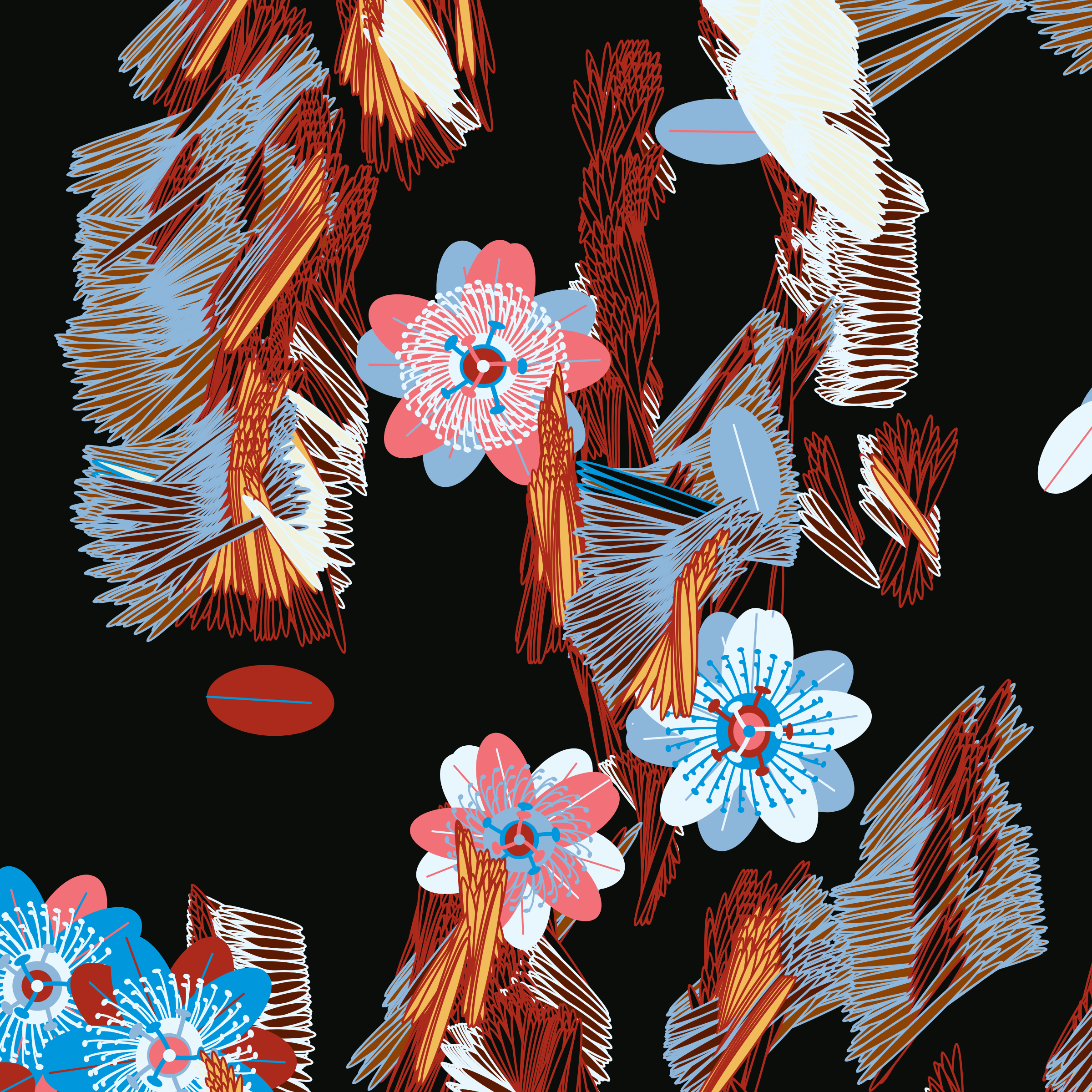 “Fragments of an infinite field” is a compositional system in which an idealized plant species is generated and arranged in a potentially infinite field of foliage. The main environmental parameter of the composition is the determination of a season of the year. The season determines the landscape’s colors and defines specific phenomena for each of them, such as rain in summer, snow in winter, petals falling in autumn, and pollen in spring. The flower has several possible variables, which can be macro aspects, affecting the entire population of the species, or micro, affecting each individual of the species differently. For example, the number of petals can be equal in all individuals or not. The number of filaments and other structures of the flower can undergo minor deviations, generating small mutations. The confusion between the figure (plant) and the background (earth, sky, other natural elements) is fascinating from a compositional point of view. The background colors are, most of the time, colors present in the figures, often breaking the boundary between them and, therefore, generating chromatic masses. In this project I also intend to research the following question: How to create parameters that resemble a living organism's growth? In this sense, the project approaches digital morphogenesis and the development of procedural organisms.
