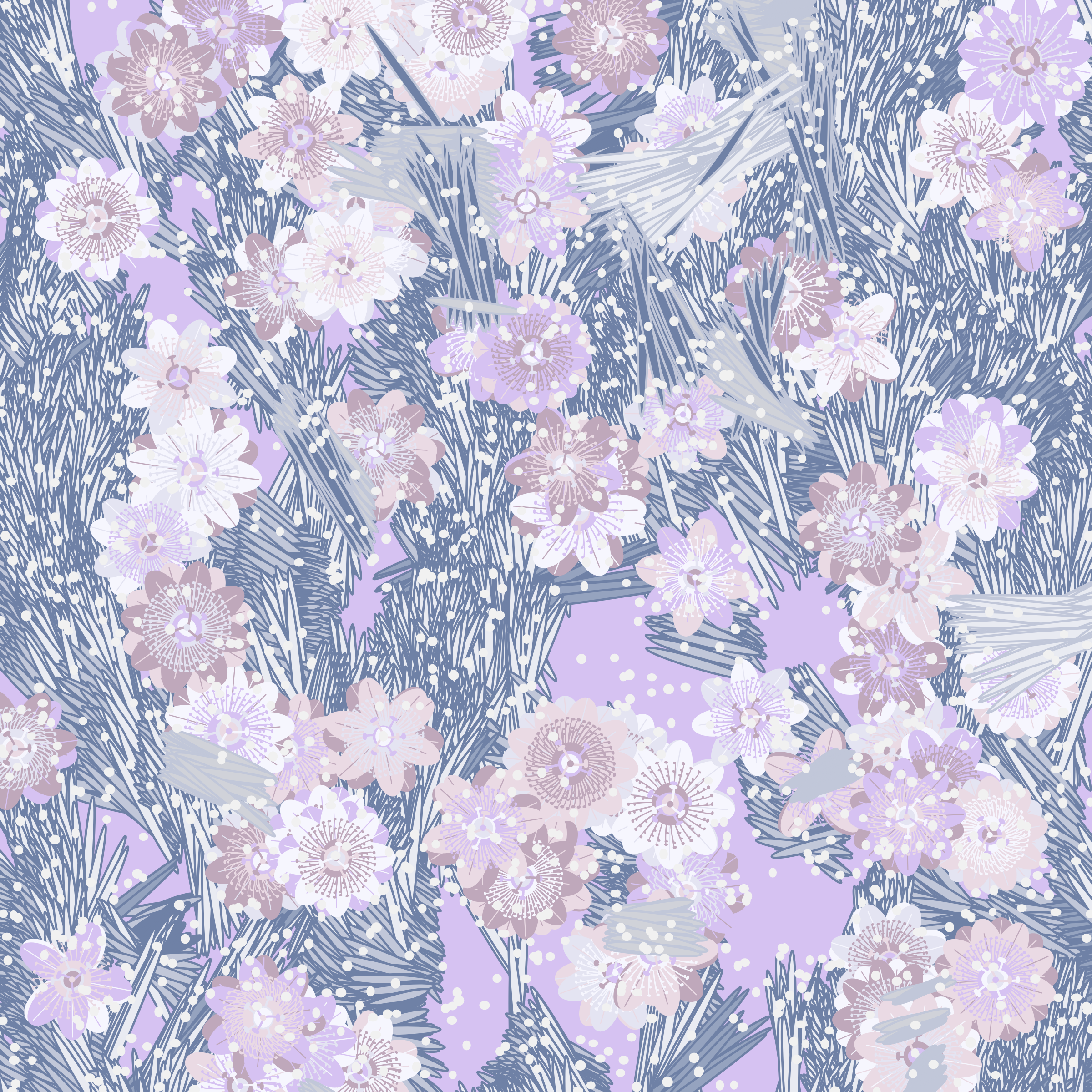 “Fragments of an infinite field” is a compositional system in which an idealized plant species is generated and arranged in a potentially infinite field of foliage. The main environmental parameter of the composition is the determination of a season of the year. The season determines the landscape’s colors and defines specific phenomena for each of them, such as rain in summer, snow in winter, petals falling in autumn, and pollen in spring. The flower has several possible variables, which can be macro aspects, affecting the entire population of the species, or micro, affecting each individual of the species differently. For example, the number of petals can be equal in all individuals or not. The number of filaments and other structures of the flower can undergo minor deviations, generating small mutations. The confusion between the figure (plant) and the background (earth, sky, other natural elements) is fascinating from a compositional point of view. The background colors are, most of the time, colors present in the figures, often breaking the boundary between them and, therefore, generating chromatic masses. In this project I also intend to research the following question: How to create parameters that resemble a living organism's growth? In this sense, the project approaches digital morphogenesis and the development of procedural organisms.