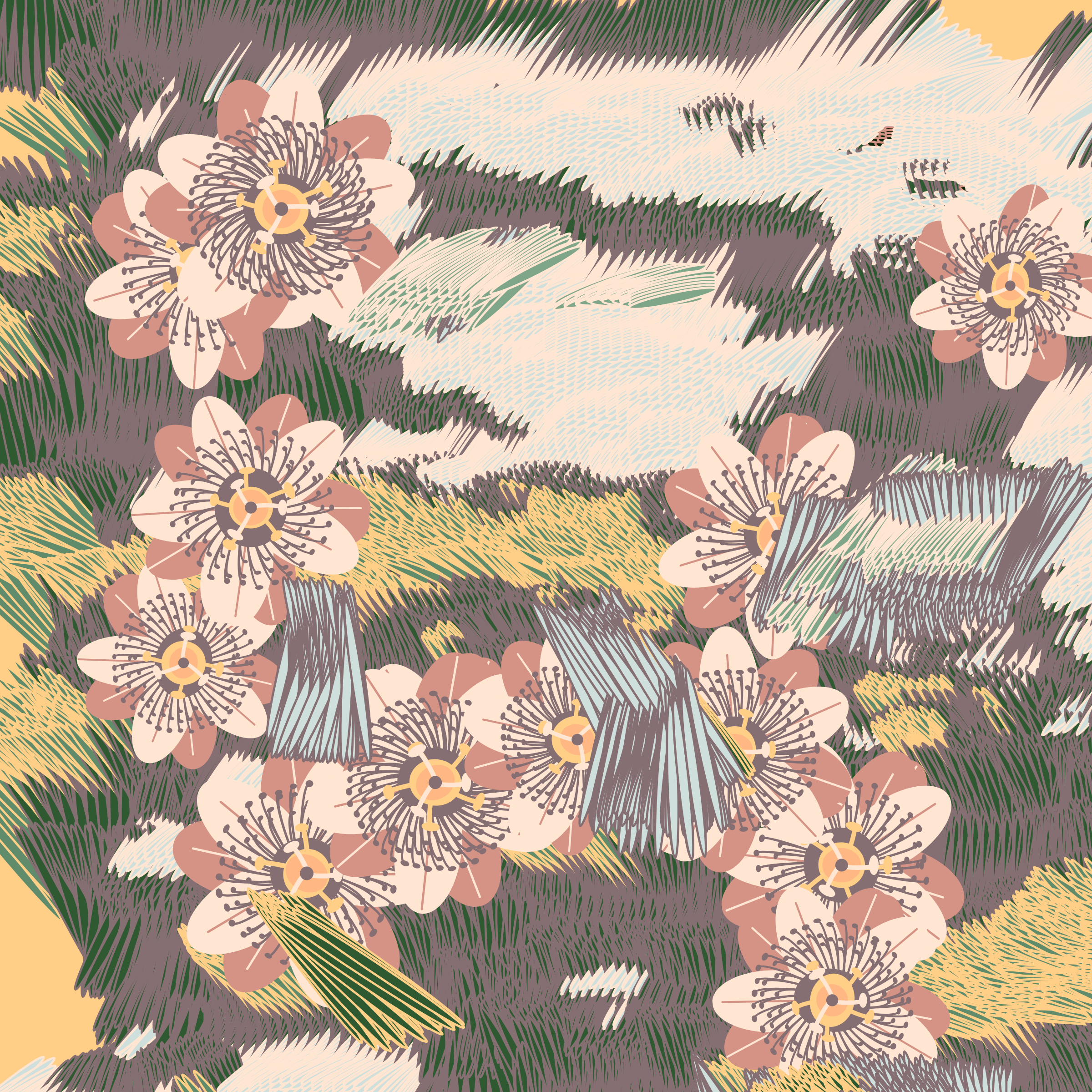 “Fragments of an infinite field” is a compositional system in which an idealized plant species is generated and arranged in a potentially infinite field of foliage. The main environmental parameter of the composition is the determination of a season of the year. The season determines the landscape’s colors and defines specific phenomena for each of them, such as rain in summer, snow in winter, petals falling in autumn, and pollen in spring. The flower has several possible variables, which can be macro aspects, affecting the entire population of the species, or micro, affecting each individual of the species differently. For example, the number of petals can be equal in all individuals or not. The number of filaments and other structures of the flower can undergo minor deviations, generating small mutations. The confusion between the figure (plant) and the background (earth, sky, other natural elements) is fascinating from a compositional point of view. The background colors are, most of the time, colors present in the figures, often breaking the boundary between them and, therefore, generating chromatic masses. In this project I also intend to research the following question: How to create parameters that resemble a living organism's growth? In this sense, the project approaches digital morphogenesis and the development of procedural organisms.