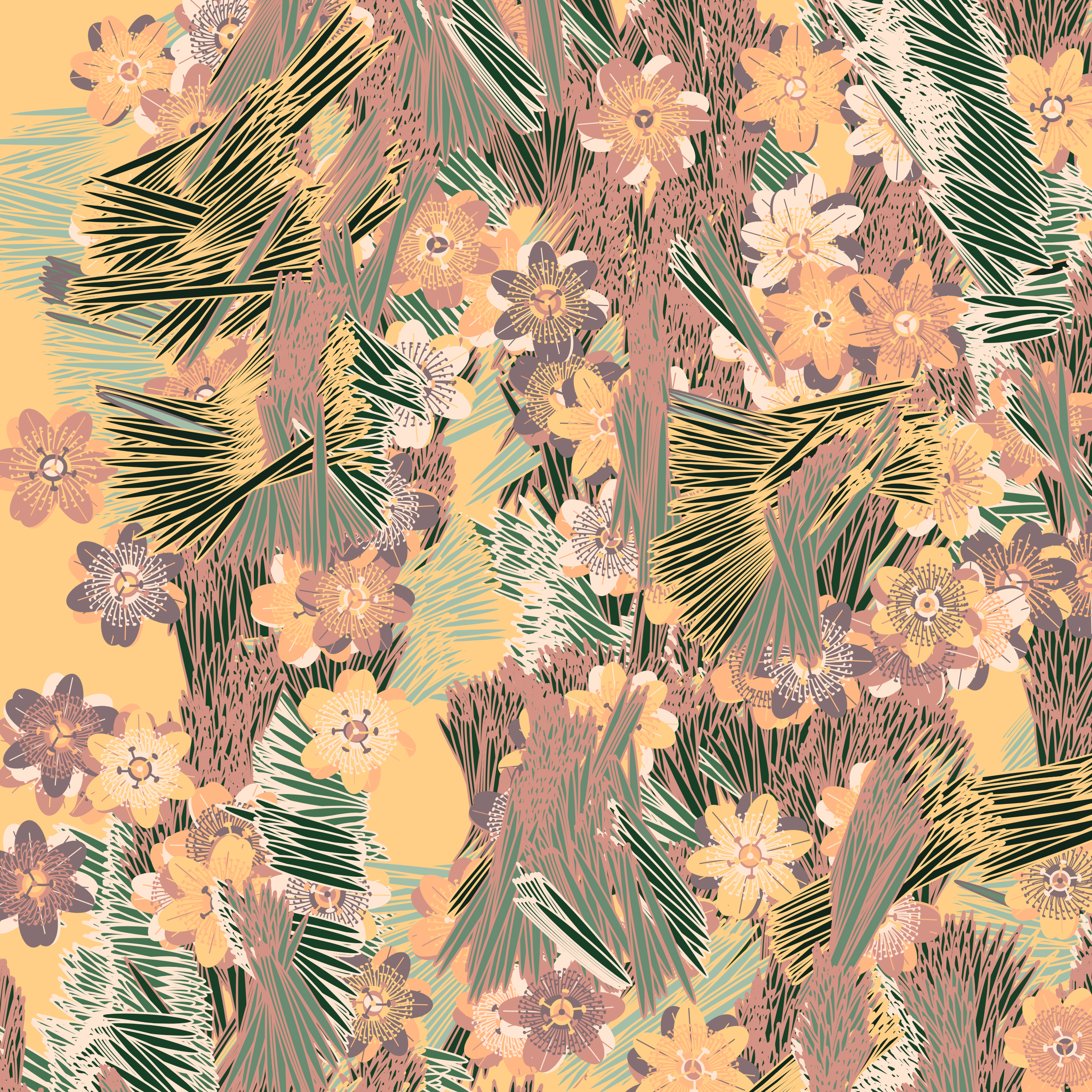 “Fragments of an infinite field” is a compositional system in which an idealized plant species is generated and arranged in a potentially infinite field of foliage. The main environmental parameter of the composition is the determination of a season of the year. The season determines the landscape’s colors and defines specific phenomena for each of them, such as rain in summer, snow in winter, petals falling in autumn, and pollen in spring. The flower has several possible variables, which can be macro aspects, affecting the entire population of the species, or micro, affecting each individual of the species differently. For example, the number of petals can be equal in all individuals or not. The number of filaments and other structures of the flower can undergo minor deviations, generating small mutations. The confusion between the figure (plant) and the background (earth, sky, other natural elements) is fascinating from a compositional point of view. The background colors are, most of the time, colors present in the figures, often breaking the boundary between them and, therefore, generating chromatic masses. In this project I also intend to research the following question: How to create parameters that resemble a living organism's growth? In this sense, the project approaches digital morphogenesis and the development of procedural organisms.