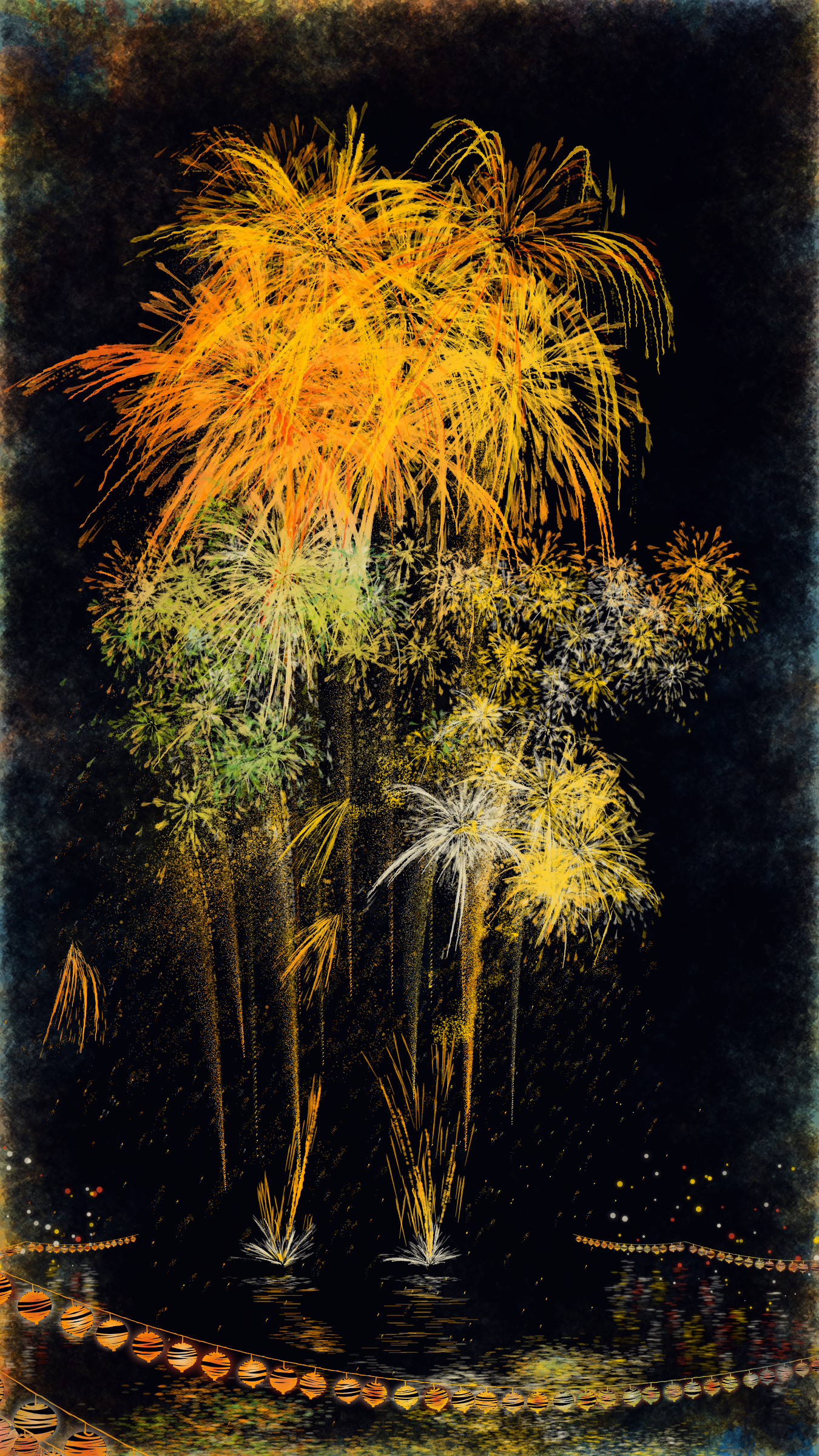 With fireworks as the central theme, it consists of the water surface reflecting the fireworks, the city lights in the distance, the silhouettes of the torii gates and arch bridge, and the twinkling lanterns. The shady black background expresses the smoky atmosphere.