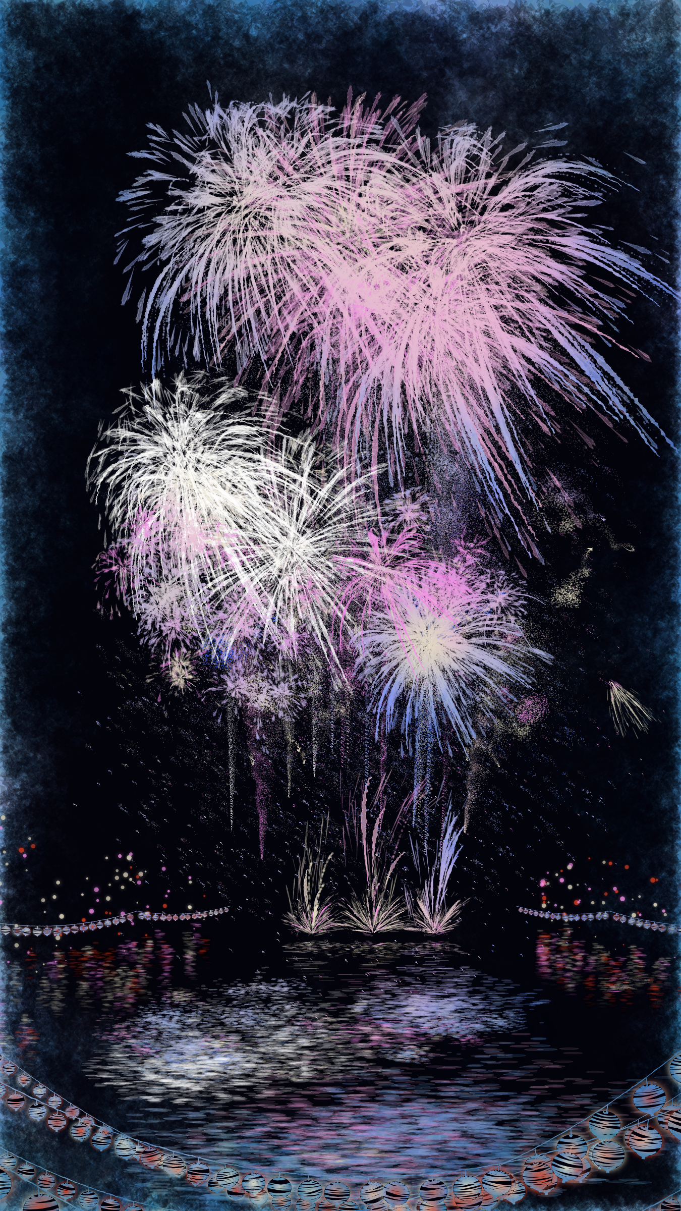 With fireworks as the central theme, it consists of the water surface reflecting the fireworks, the city lights in the distance, the silhouettes of the torii gates and arch bridge, and the twinkling lanterns. The shady black background expresses the smoky atmosphere.