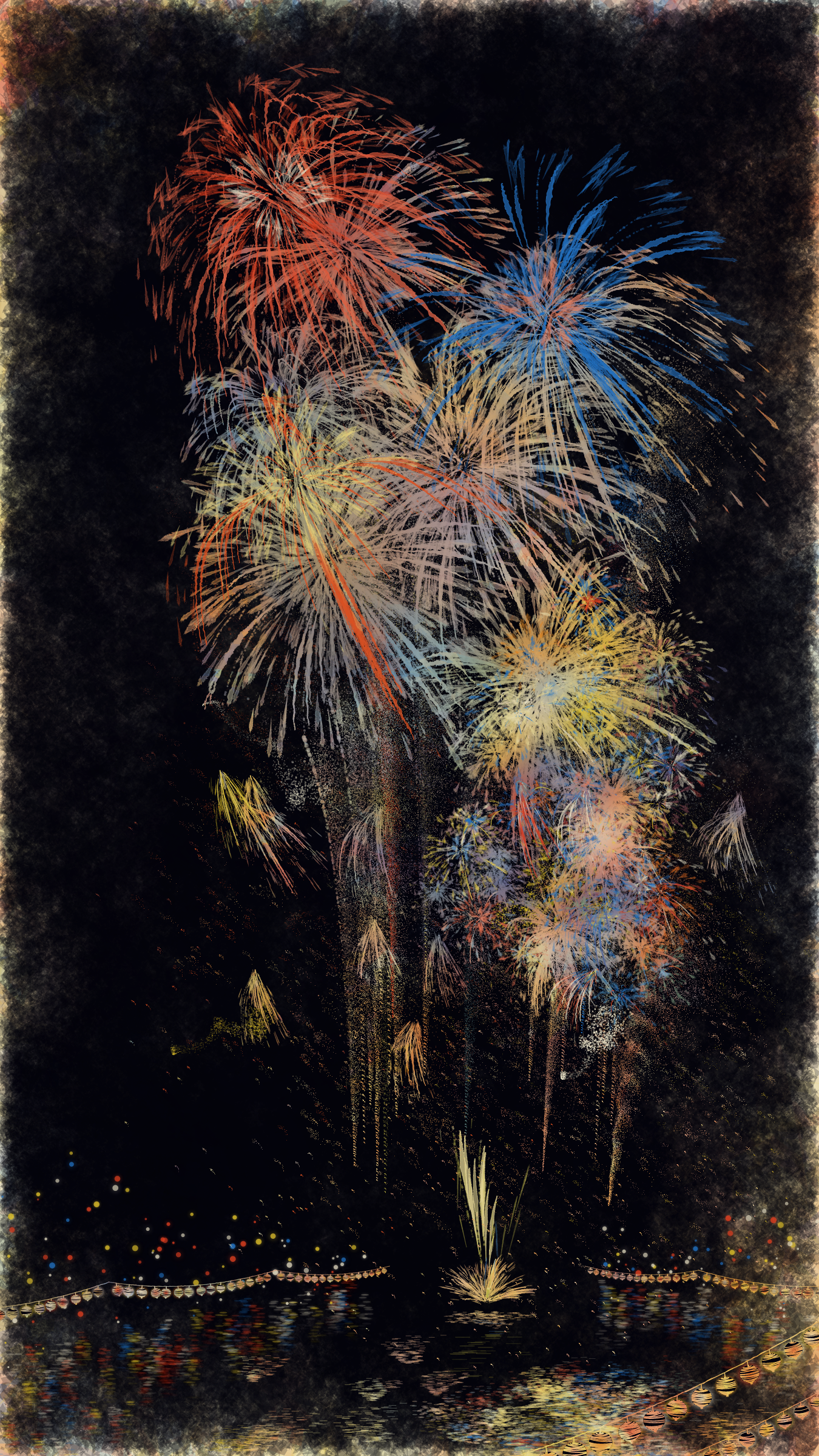The drawing algorithm of the work is inspired by traditional woodblock prints and contemporary scratch art. Base layer is drawn with pale watercolor-like gradation. On top of that, the shady black background is drawn. Then, the outline of the fireworks is carved out.
