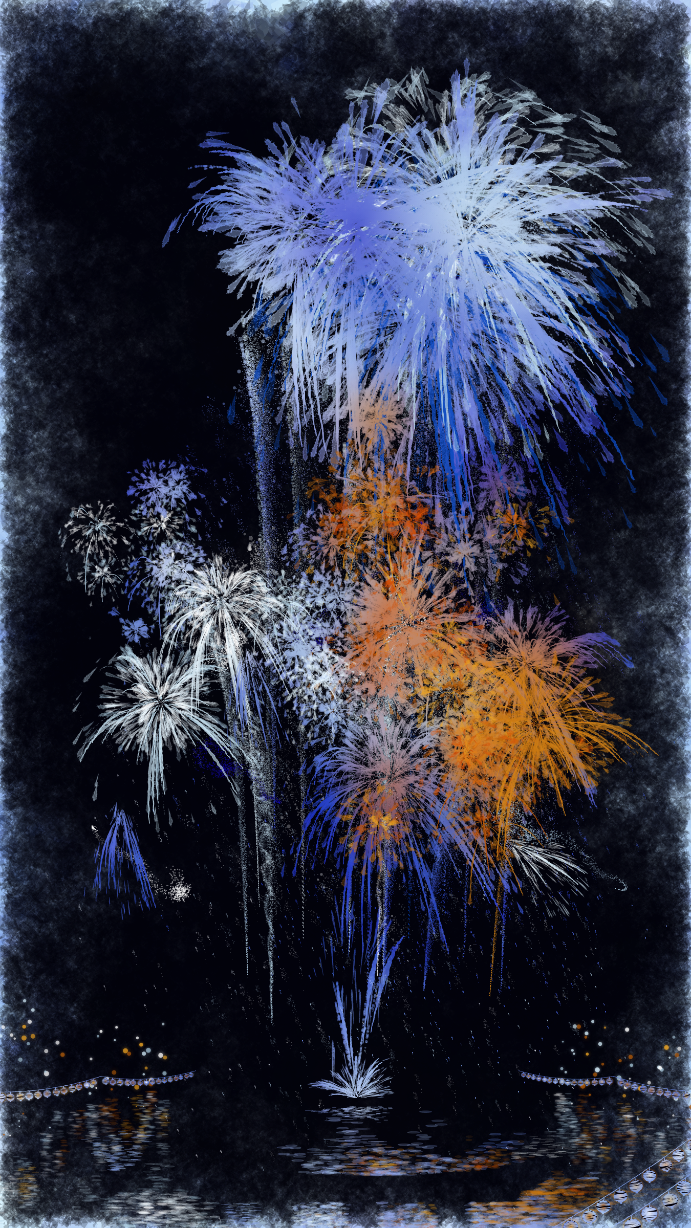 With fireworks as the central theme, it consists of the water surface reflecting the fireworks, the city lights in the distance, the silhouettes of the torii gates and arch bridge, and the twinkling lanterns. The shady black background expresses the smoky atmosphere.