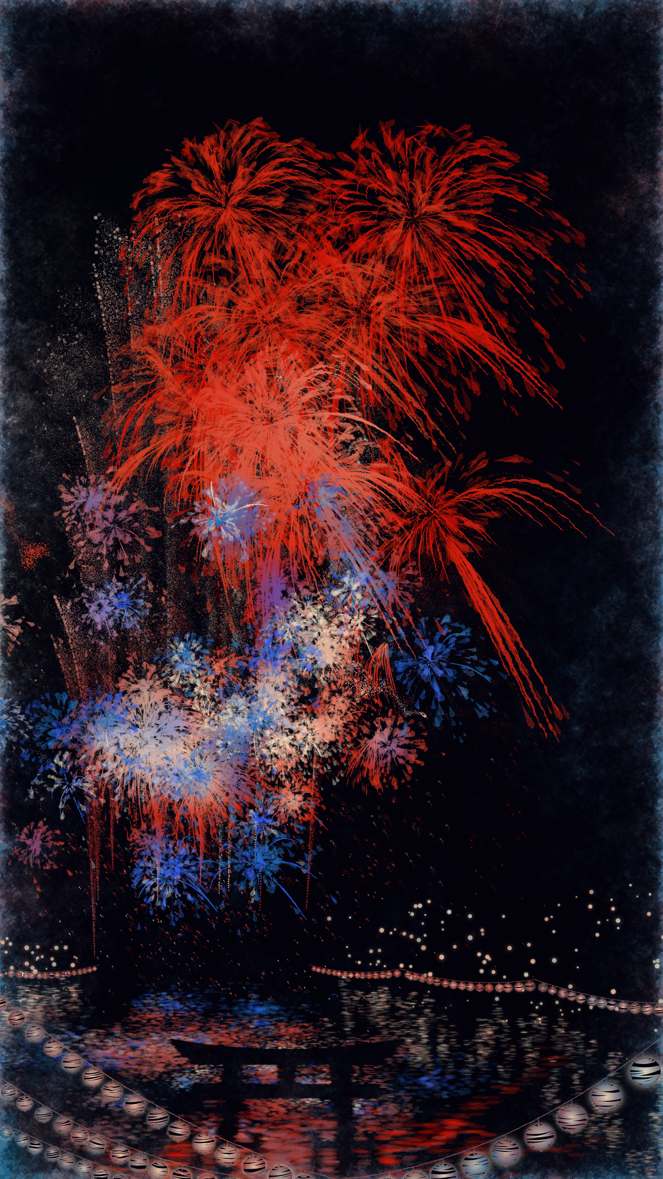 With fireworks as the central theme, it consists of the water surface reflecting the fireworks, the city lights in the distance, the silhouettes of the torii gates and arch bridge, and the twinkling lanterns. The shady black background expresses the smoky atmosphere.
