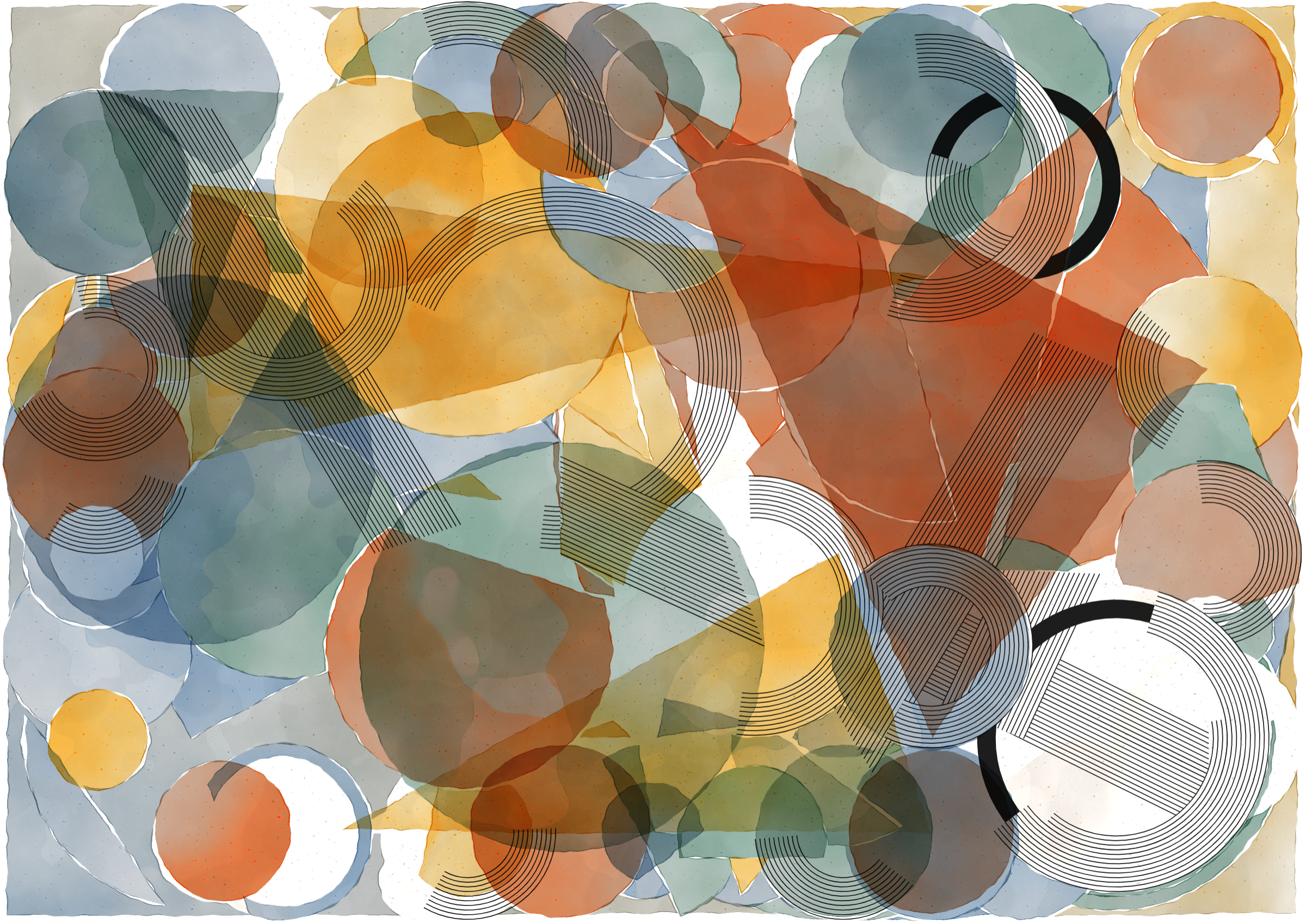 *Inprecision* is exploring the tension between the precision offered by computers and the imperfections inherent in classic art production approaches. The generative system is based on circles and triangles, perfectly aligned with each other and placed on a grid, but rendered with a technique inspired by the look of water color giving a high degree of imperfection in the rendered output. The precision of the underlying system is then again accentuated by a layer of hyper precise line drawings, outlining the used geometries and providing a scaffold for the underlying colors.