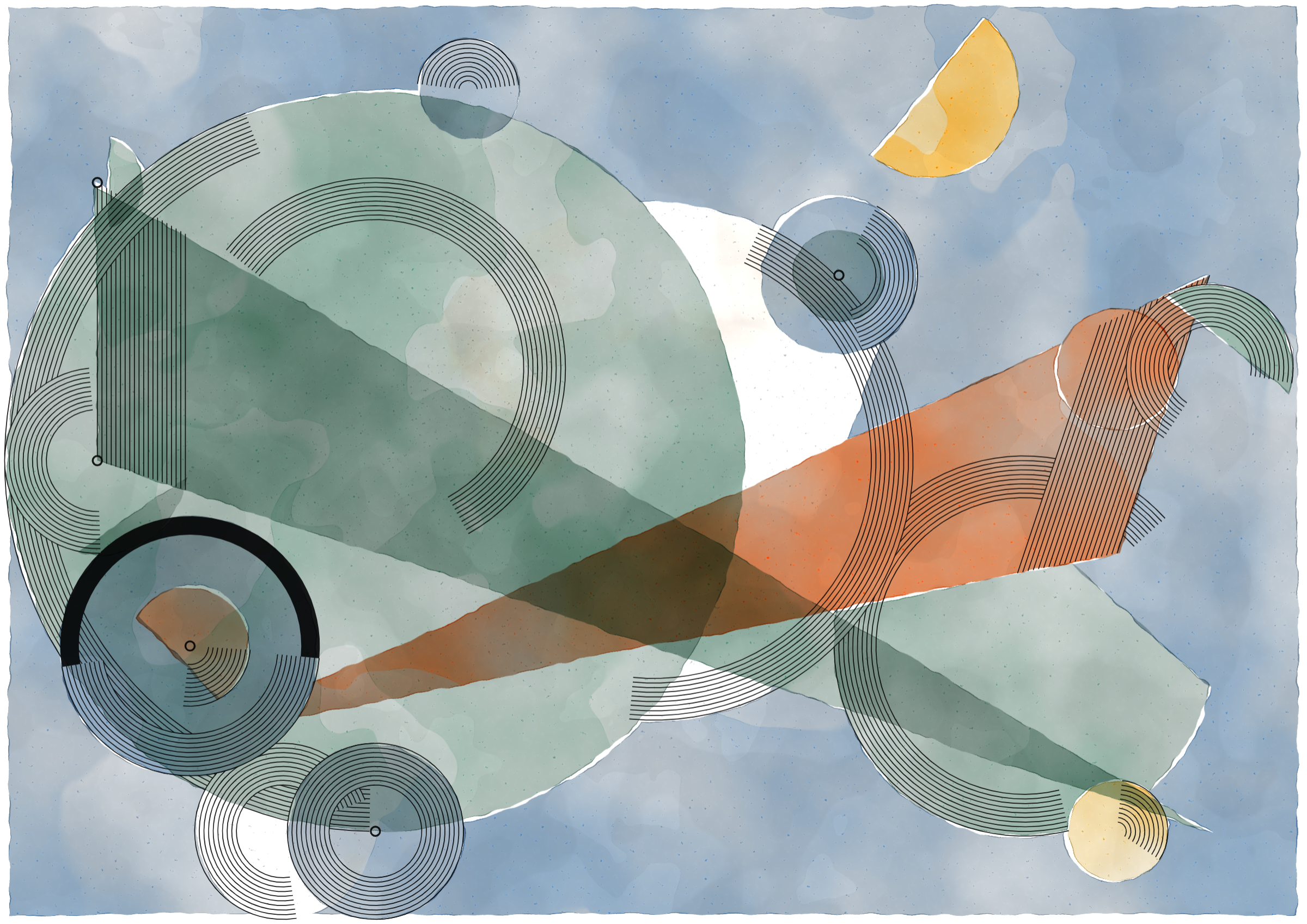 *Inprecision* is exploring the tension between the precision offered by computers and the imperfections inherent in classic art production approaches. The generative system is based on circles and triangles, perfectly aligned with each other and placed on a grid, but rendered with a technique inspired by the look of water color giving a high degree of imperfection in the rendered output. The precision of the underlying system is then again accentuated by a layer of hyper precise line drawings, outlining the used geometries and providing a scaffold for the underlying colors.