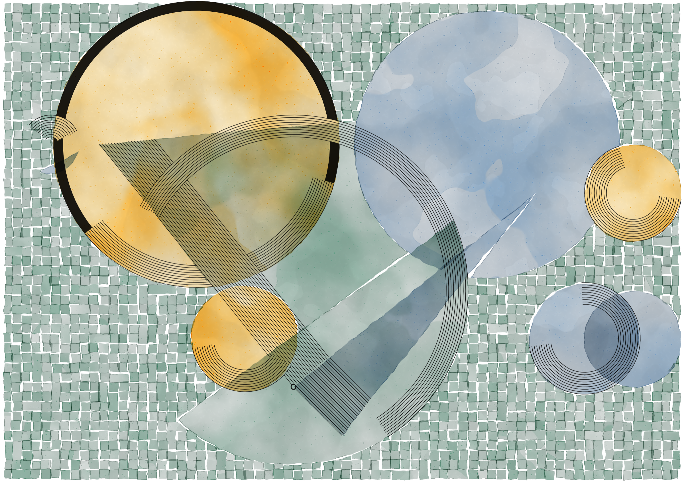 *Inprecision* is exploring the tension between the precision offered by computers and the imperfections inherent in classic art production approaches. The generative system is based on circles and triangles, perfectly aligned with each other and placed on a grid, but rendered with a technique inspired by the look of water color giving a high degree of imperfection in the rendered output. The precision of the underlying system is then again accentuated by a layer of hyper precise line drawings, outlining the used geometries and providing a scaffold for the underlying colors.