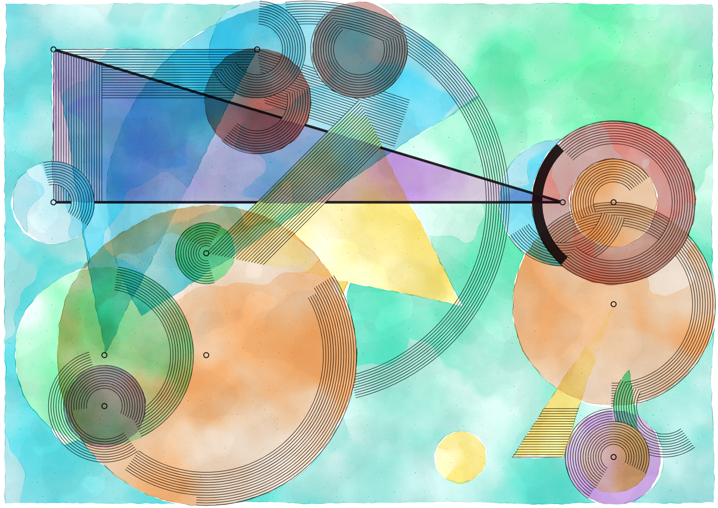 *Inprecision* is exploring the tension between the precision offered by computers and the imperfections inherent in classic art production approaches. The generative system is based on circles and triangles, perfectly aligned with each other and placed on a grid, but rendered with a technique inspired by the look of water color giving a high degree of imperfection in the rendered output. The precision of the underlying system is then again accentuated by a layer of hyper precise line drawings, outlining the used geometries and providing a scaffold for the underlying colors.