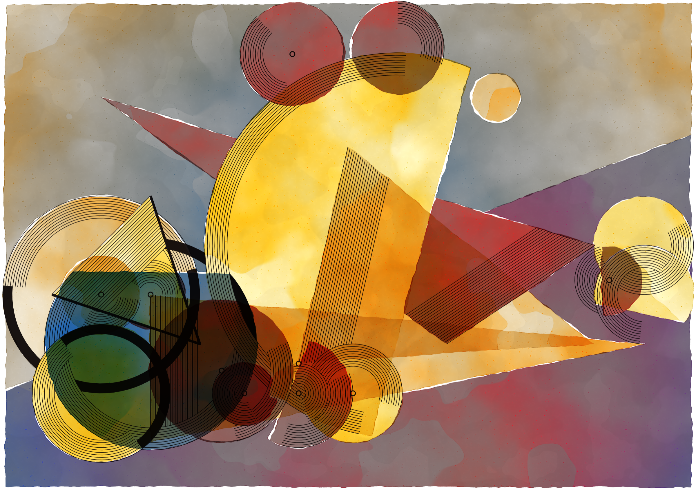 *Inprecision* is exploring the tension between the precision offered by computers and the imperfections inherent in classic art production approaches. The generative system is based on circles and triangles, perfectly aligned with each other and placed on a grid, but rendered with a technique inspired by the look of water color giving a high degree of imperfection in the rendered output. The precision of the underlying system is then again accentuated by a layer of hyper precise line drawings, outlining the used geometries and providing a scaffold for the underlying colors.