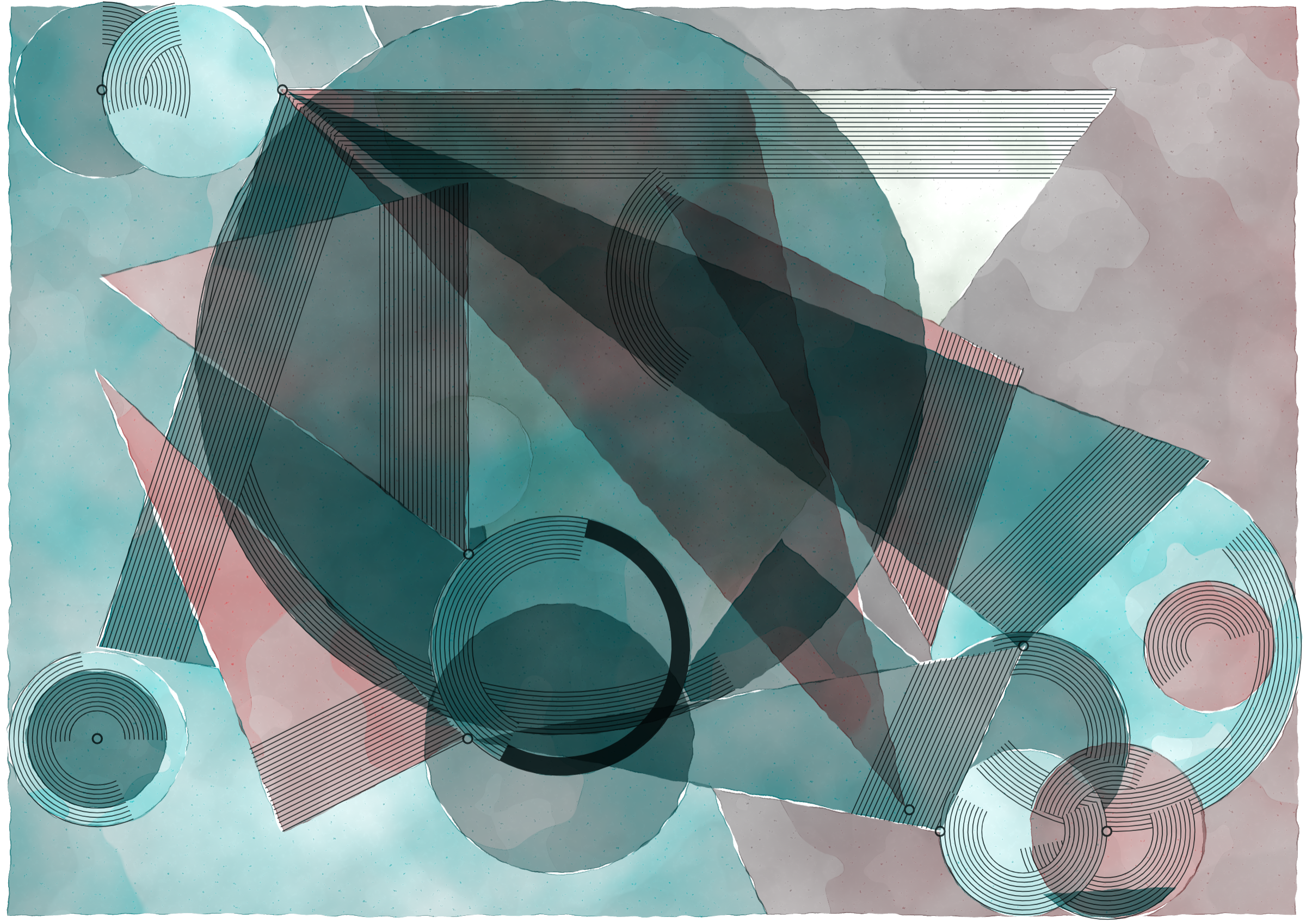 *Inprecision* is exploring the tension between the precision offered by computers and the imperfections inherent in classic art production approaches. The generative system is based on circles and triangles, perfectly aligned with each other and placed on a grid, but rendered with a technique inspired by the look of water color giving a high degree of imperfection in the rendered output. The precision of the underlying system is then again accentuated by a layer of hyper precise line drawings, outlining the used geometries and providing a scaffold for the underlying colors.