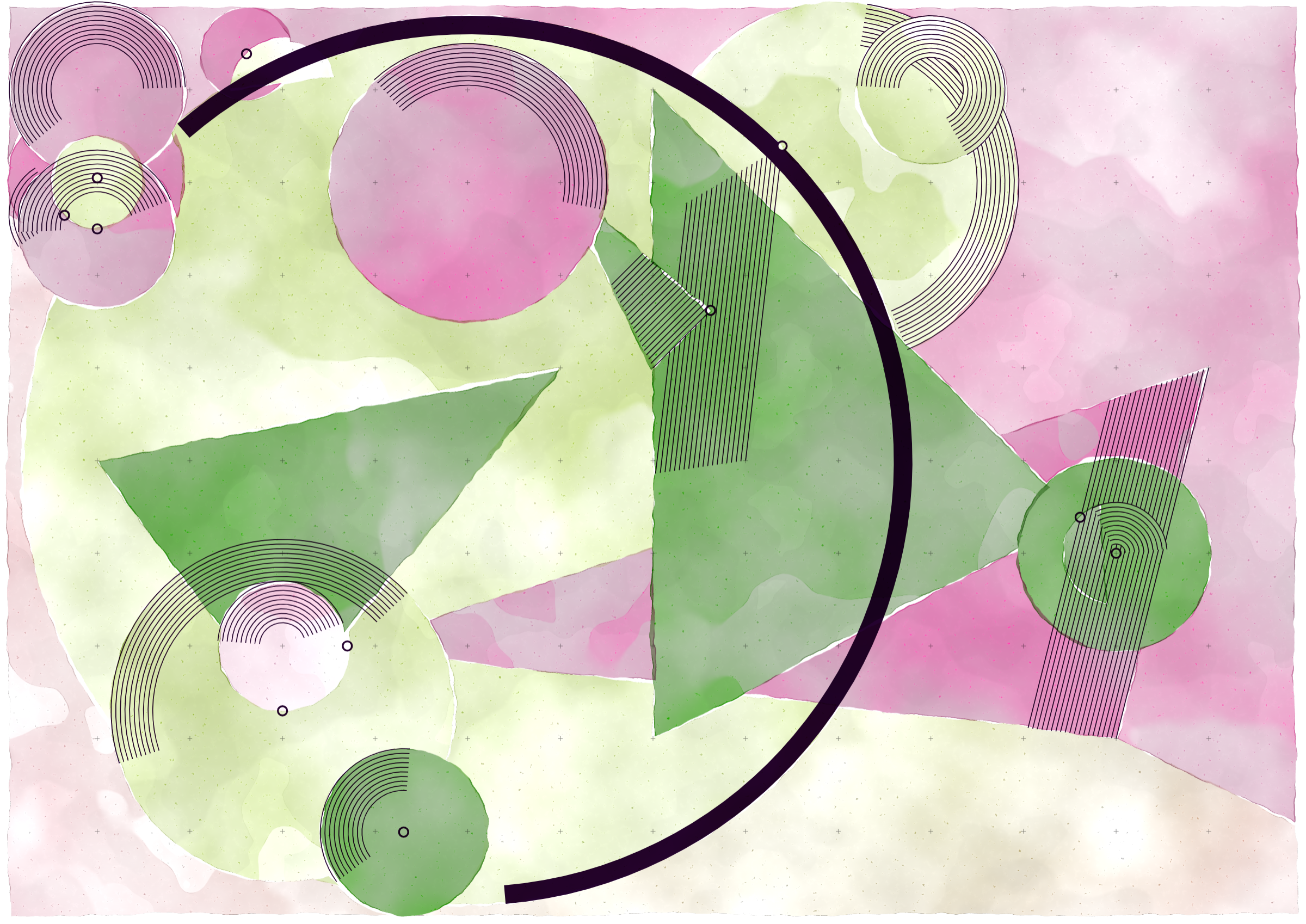 *Inprecision* is exploring the tension between the precision offered by computers and the imperfections inherent in classic art production approaches. The generative system is based on circles and triangles, perfectly aligned with each other and placed on a grid, but rendered with a technique inspired by the look of water color giving a high degree of imperfection in the rendered output. The precision of the underlying system is then again accentuated by a layer of hyper precise line drawings, outlining the used geometries and providing a scaffold for the underlying colors.