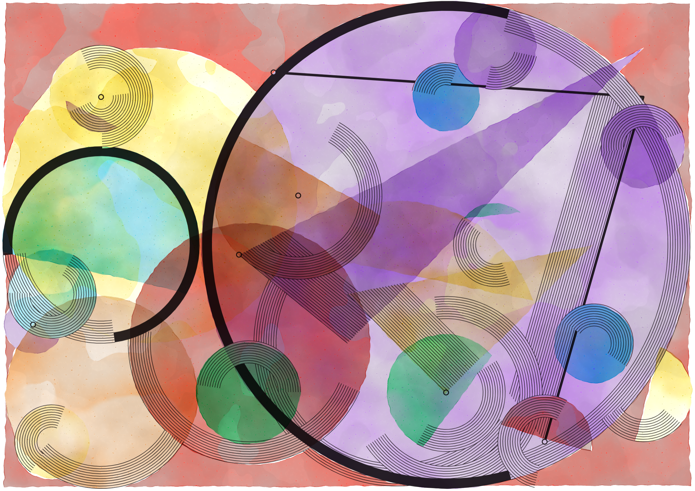 *Inprecision* is exploring the tension between the precision offered by computers and the imperfections inherent in classic art production approaches. The generative system is based on circles and triangles, perfectly aligned with each other and placed on a grid, but rendered with a technique inspired by the look of water color giving a high degree of imperfection in the rendered output. The precision of the underlying system is then again accentuated by a layer of hyper precise line drawings, outlining the used geometries and providing a scaffold for the underlying colors.