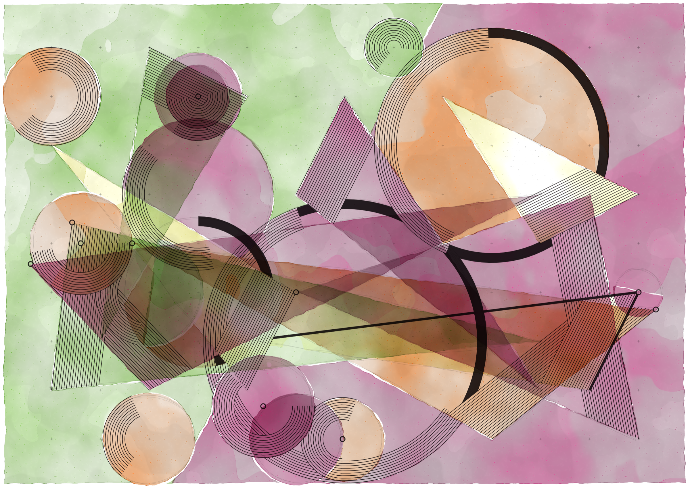 *Inprecision* is exploring the tension between the precision offered by computers and the imperfections inherent in classic art production approaches. The generative system is based on circles and triangles, perfectly aligned with each other and placed on a grid, but rendered with a technique inspired by the look of water color giving a high degree of imperfection in the rendered output. The precision of the underlying system is then again accentuated by a layer of hyper precise line drawings, outlining the used geometries and providing a scaffold for the underlying colors.