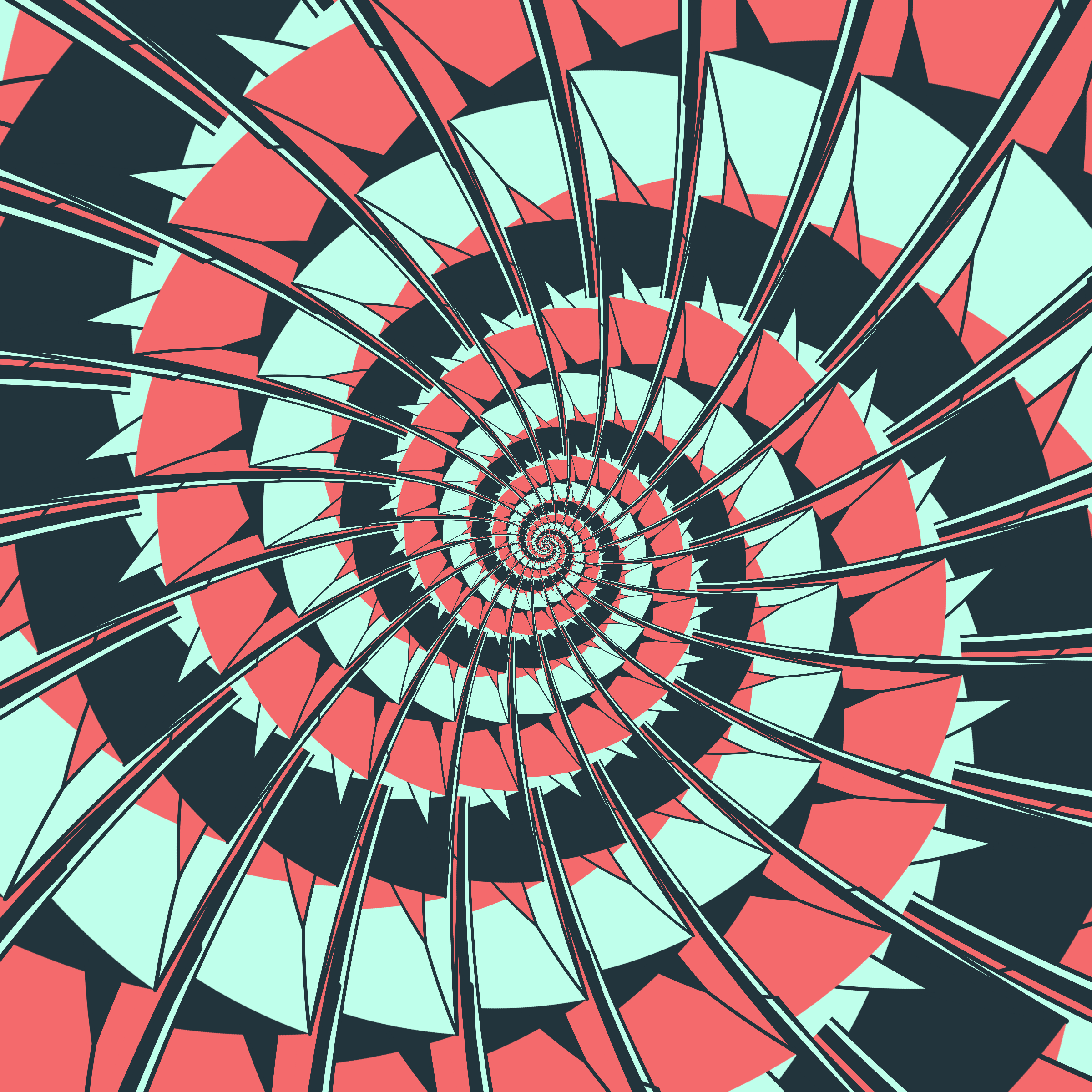 Escher-style tiling of a plane, gone wrong. Each image spins hash-driven colors, shapes, and symmetries into infinity. Fly through the spiral as it morphs between beauty and madness. Keys: F = Fly through/back, D = Distort on/off, Esc = Stop, S = Save image.