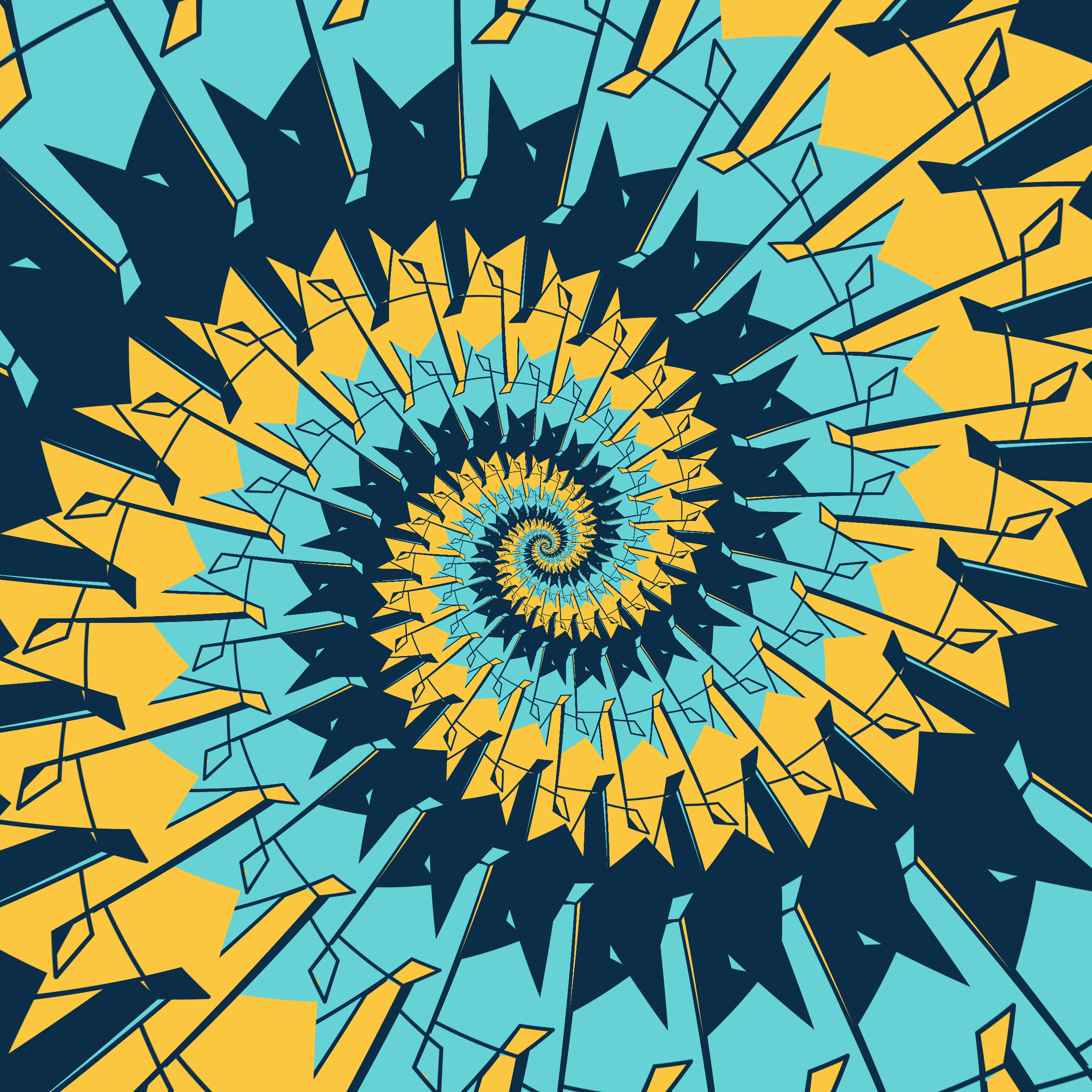 Escher-style tiling of a plane, gone wrong. Each image spins hash-driven colors, shapes, and symmetries into infinity. Fly through the spiral as it morphs between beauty and madness. Keys: F = Fly through/back, D = Distort on/off, Esc = Stop, S = Save image.
