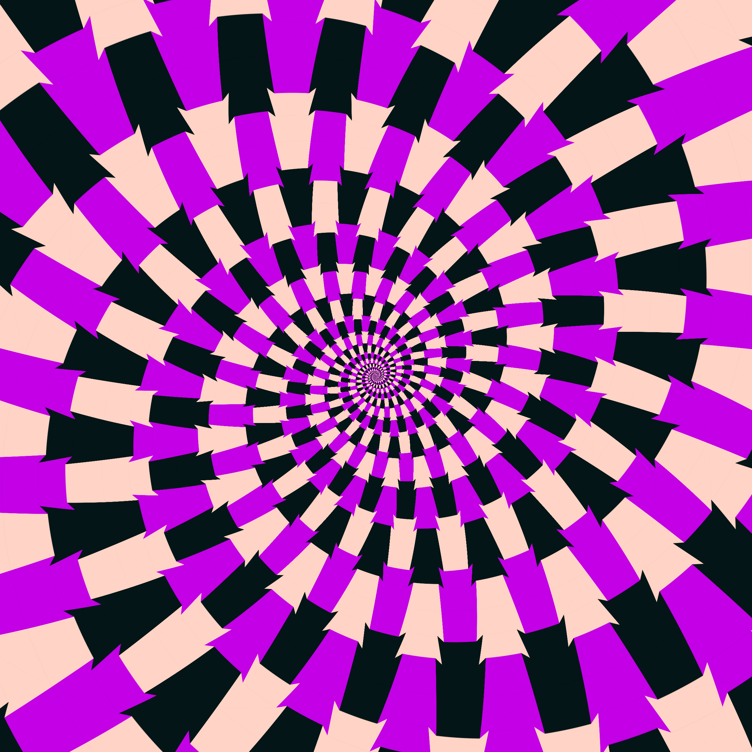 Escher-style tiling of a plane, gone wrong. Each image spins hash-driven colors, shapes, and symmetries into infinity. Fly through the spiral as it morphs between beauty and madness. Keys: F = Fly through/back, D = Distort on/off, Esc = Stop, S = Save image.