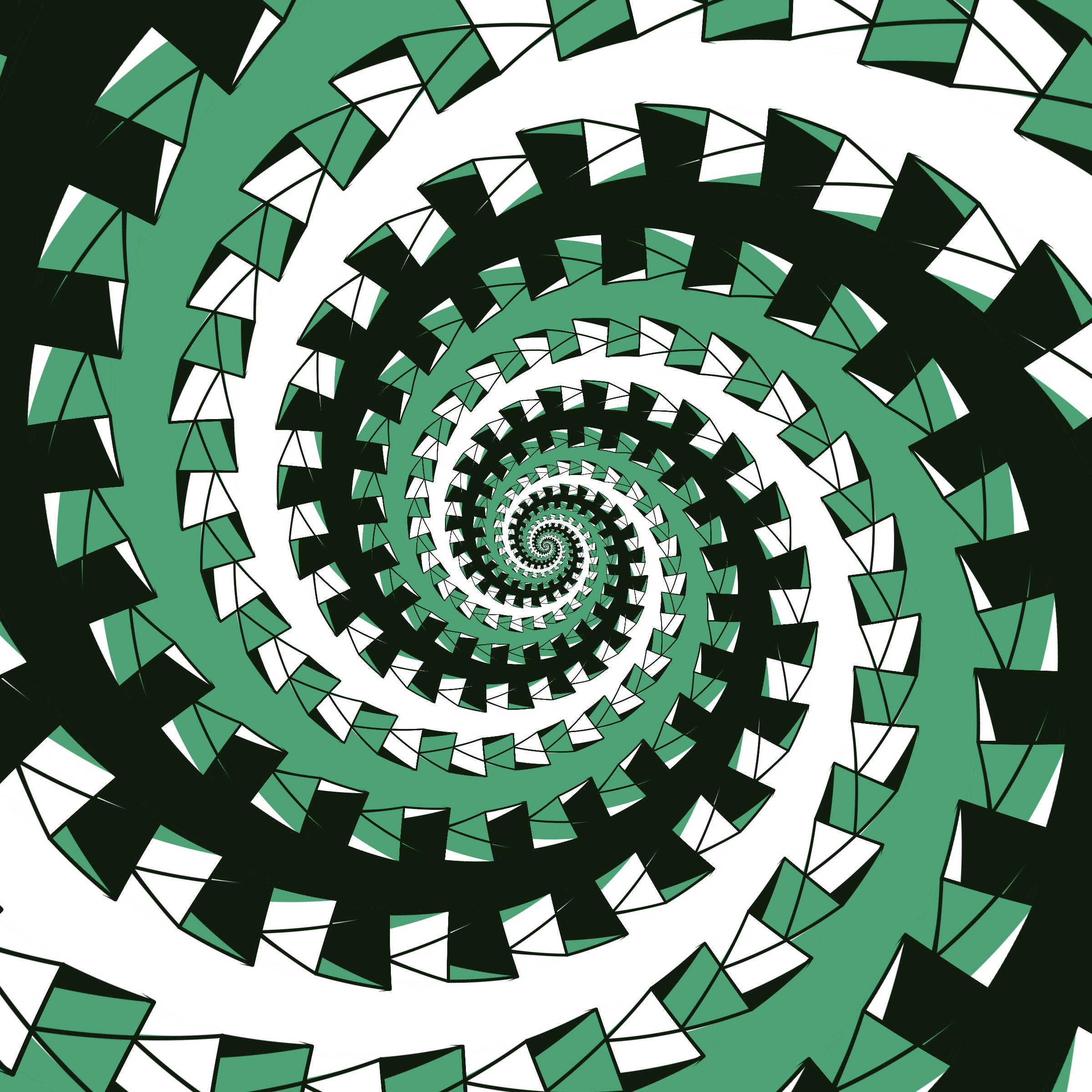 Escher-style tiling of a plane, gone wrong. Each image spins hash-driven colors, shapes, and symmetries into infinity. Fly through the spiral as it morphs between beauty and madness. Keys: F = Fly through/back, D = Distort on/off, Esc = Stop, S = Save image.