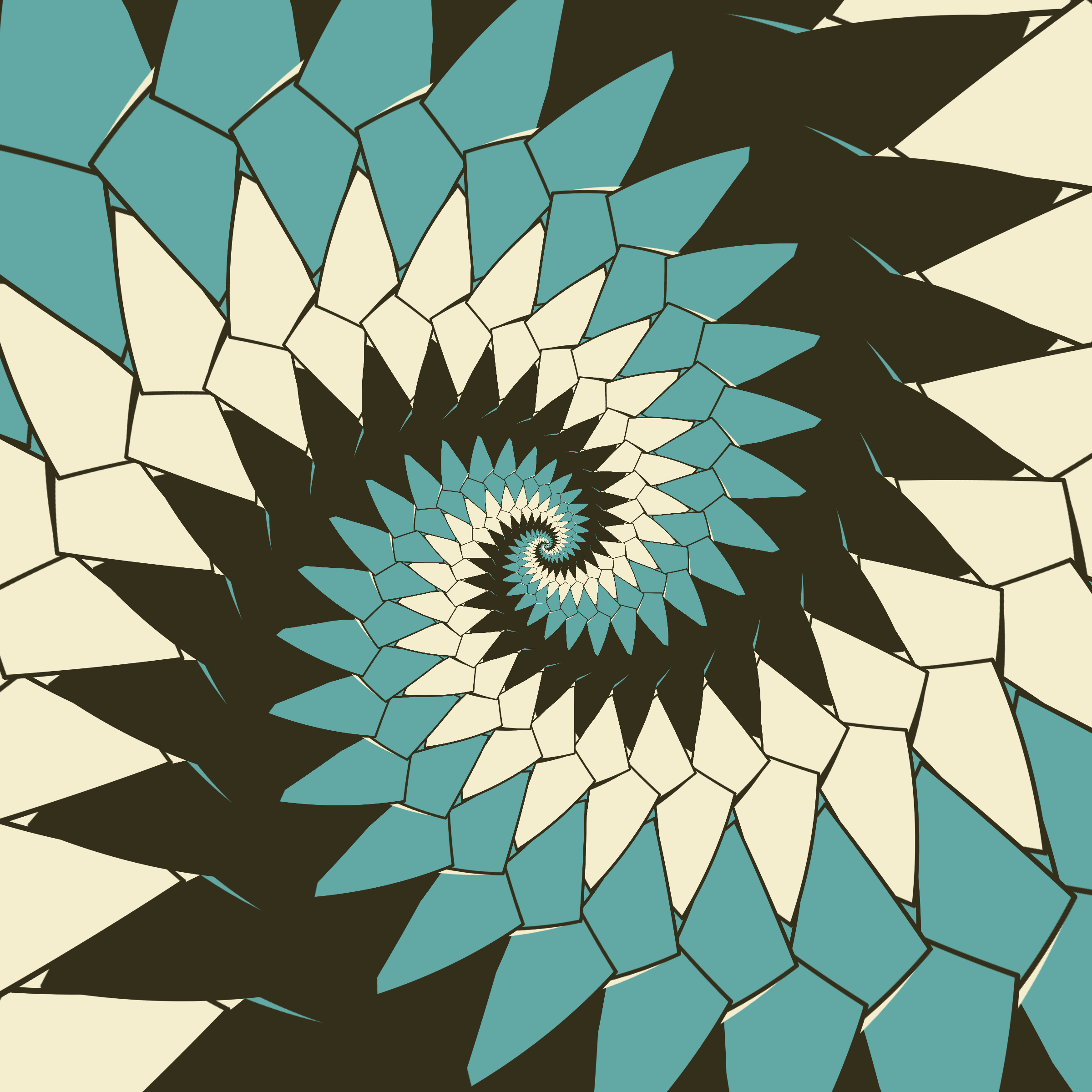 Escher-style tiling of a plane, gone wrong. Each image spins hash-driven colors, shapes, and symmetries into infinity. Fly through the spiral as it morphs between beauty and madness. Keys: F = Fly through/back, D = Distort on/off, Esc = Stop, S = Save image.