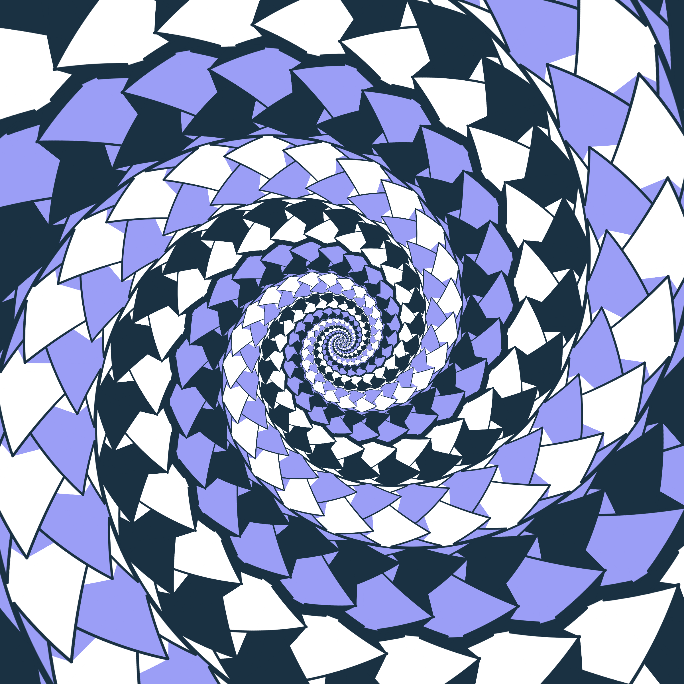 Escher-style tiling of a plane, gone wrong. Each image spins hash-driven colors, shapes, and symmetries into infinity. Fly through the spiral as it morphs between beauty and madness. Keys: F = Fly through/back, D = Distort on/off, Esc = Stop, S = Save image.