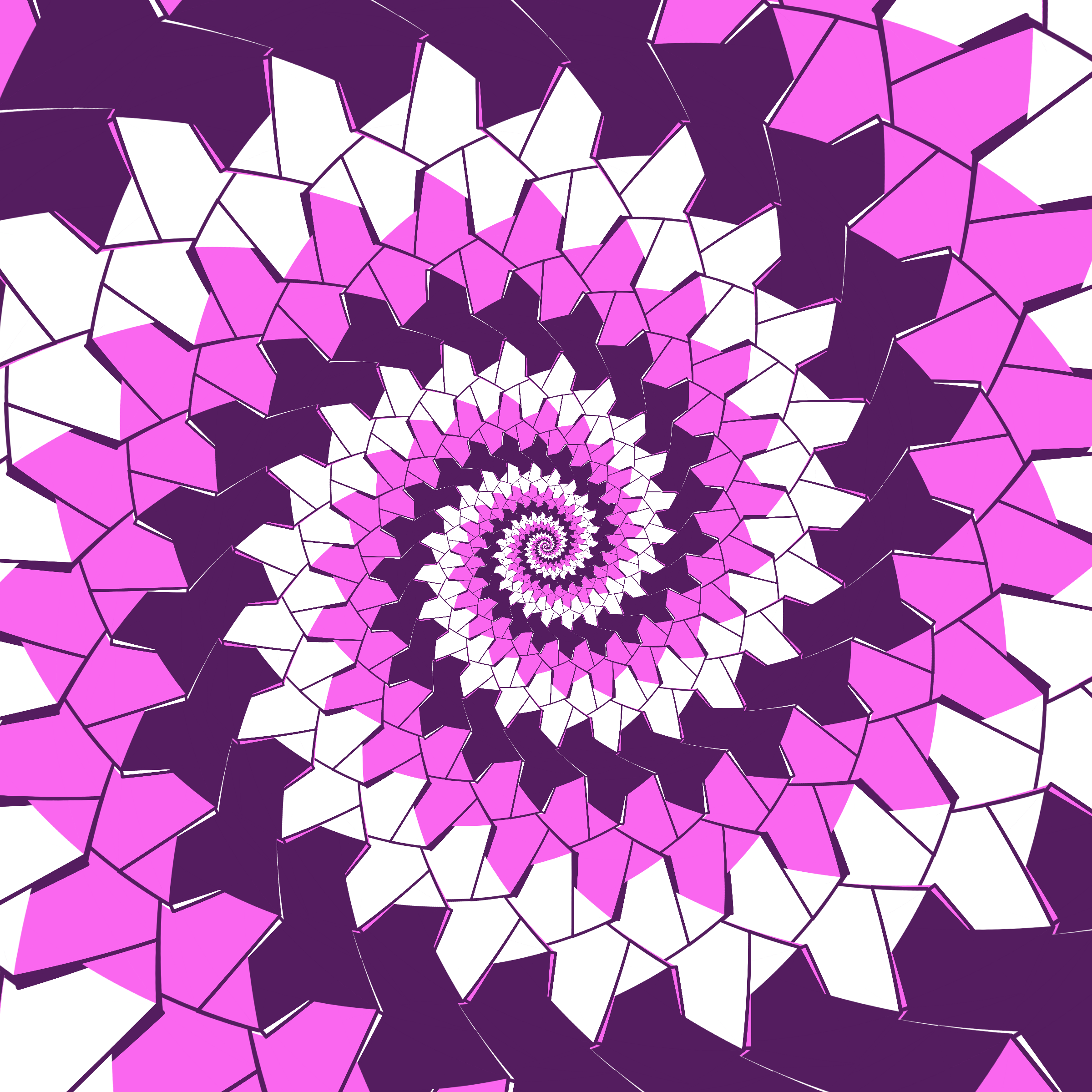 Escher-style tiling of a plane, gone wrong. Each image spins hash-driven colors, shapes, and symmetries into infinity. Fly through the spiral as it morphs between beauty and madness. Keys: F = Fly through/back, D = Distort on/off, Esc = Stop, S = Save image.