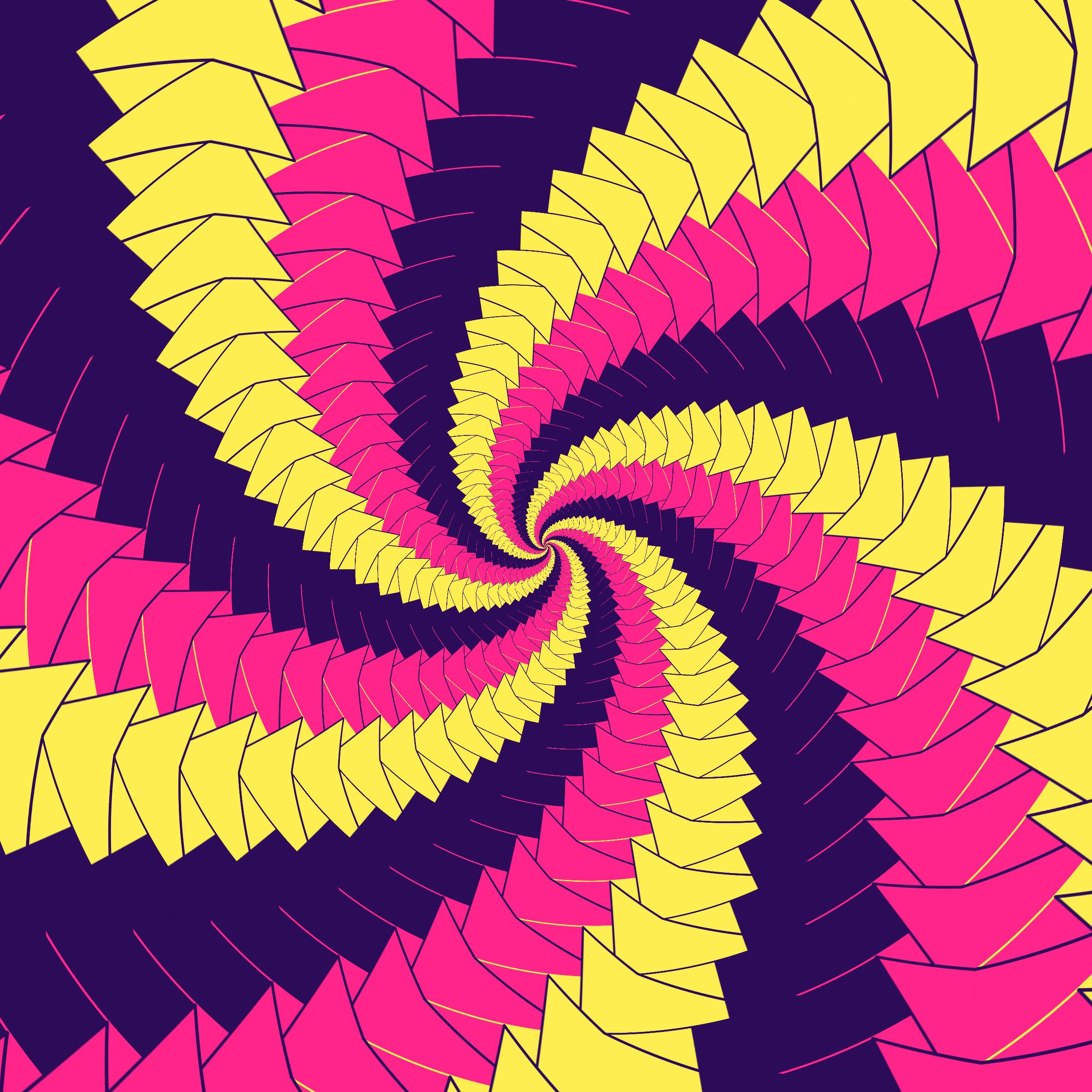 Escher-style tiling of a plane, gone wrong. Each image spins hash-driven colors, shapes, and symmetries into infinity. Fly through the spiral as it morphs between beauty and madness. Keys: F = Fly through/back, D = Distort on/off, Esc = Stop, S = Save image.