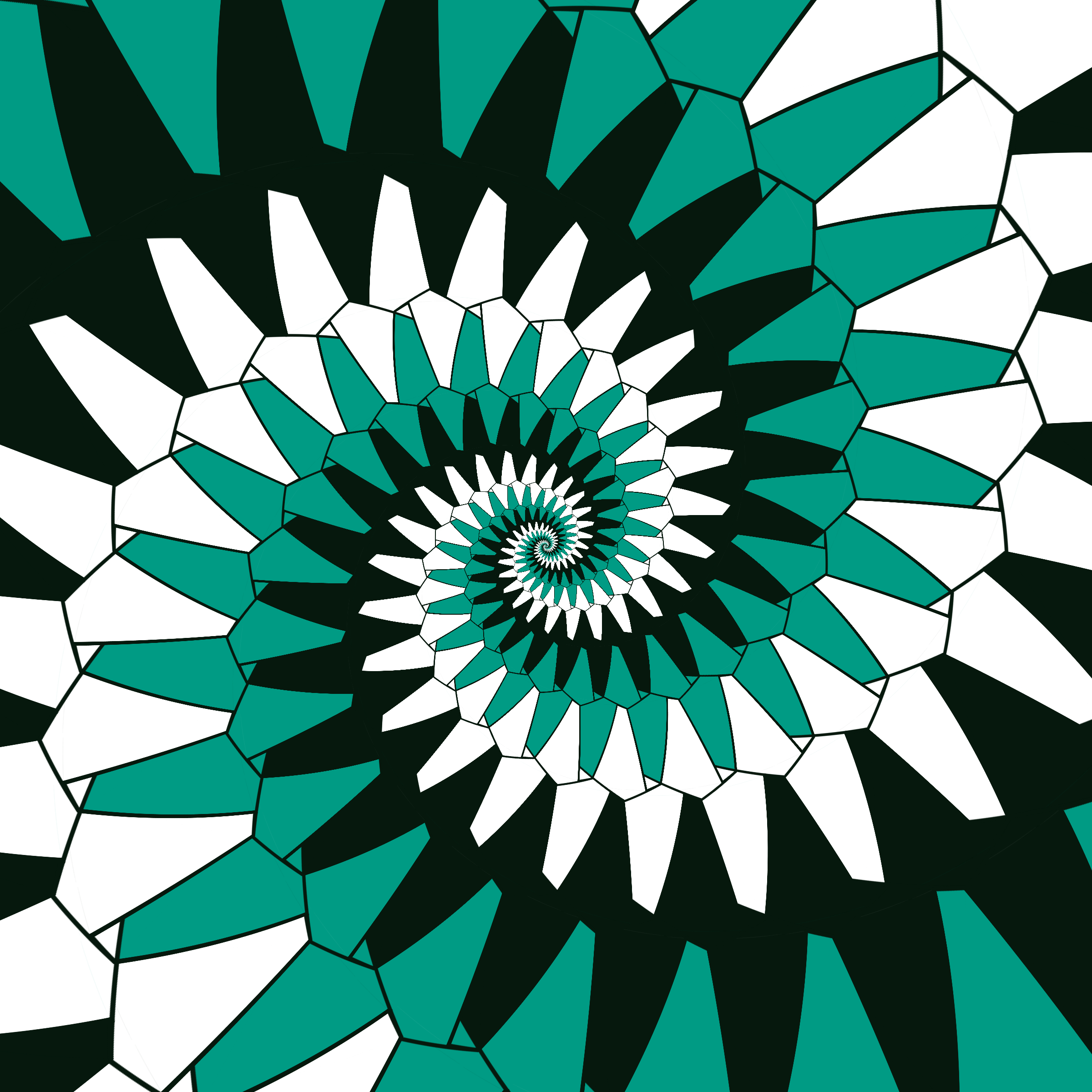Escher-style tiling of a plane, gone wrong. Each image spins hash-driven colors, shapes, and symmetries into infinity. Fly through the spiral as it morphs between beauty and madness. Keys: F = Fly through/back, D = Distort on/off, Esc = Stop, S = Save image.