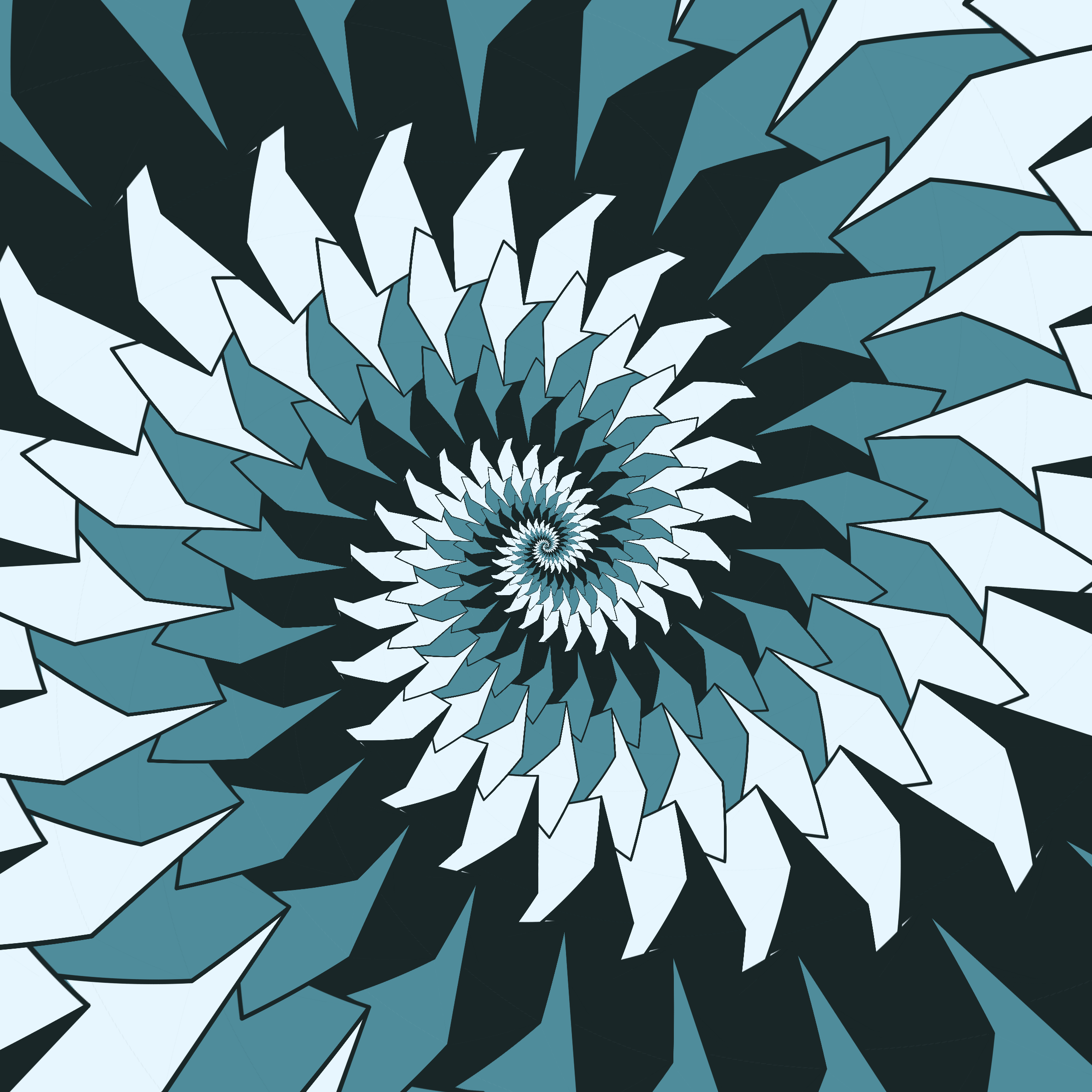 Escher-style tiling of a plane, gone wrong. Each image spins hash-driven colors, shapes, and symmetries into infinity. Fly through the spiral as it morphs between beauty and madness. Keys: F = Fly through/back, D = Distort on/off, Esc = Stop, S = Save image.