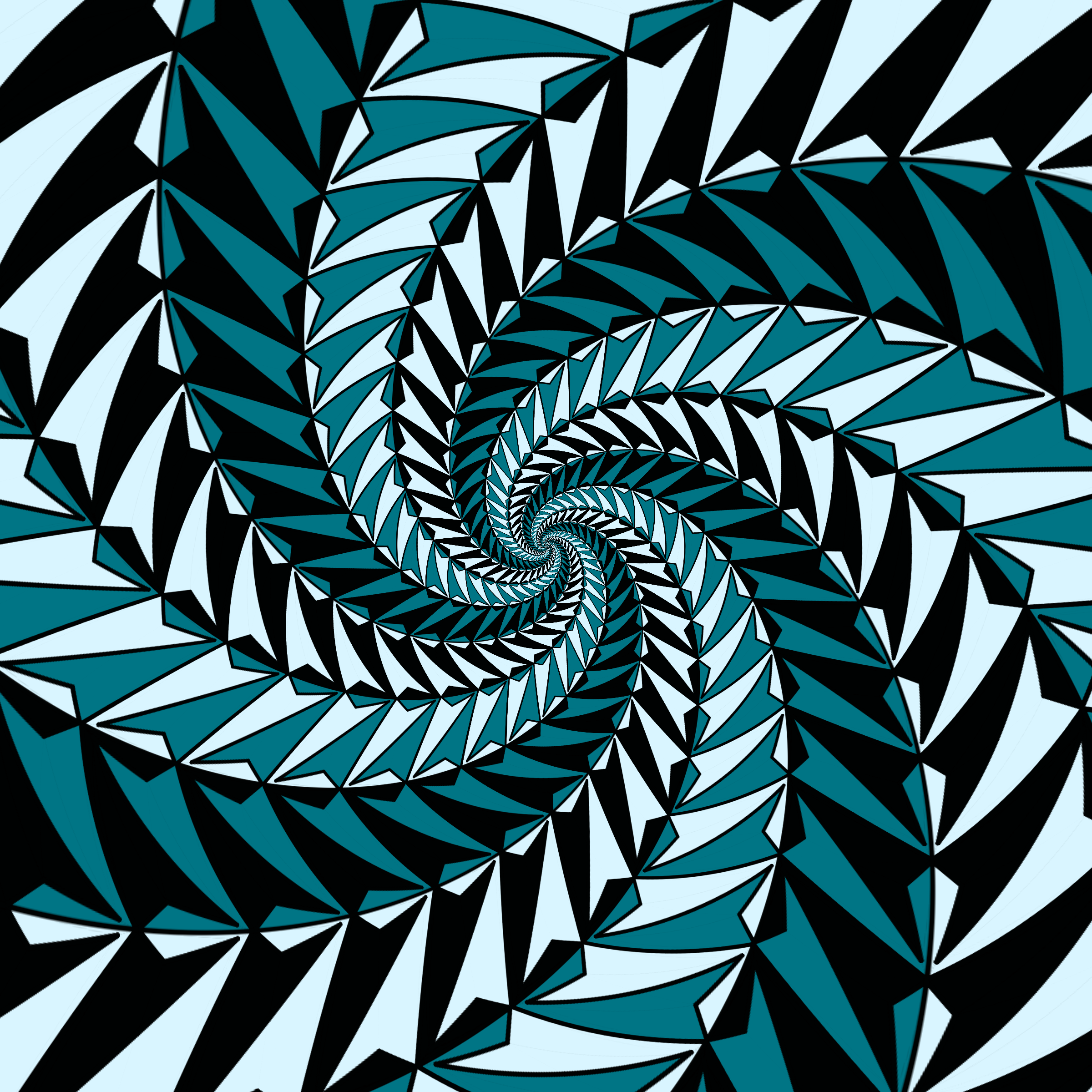 Escher-style tiling of a plane, gone wrong. Each image spins hash-driven colors, shapes, and symmetries into infinity. Fly through the spiral as it morphs between beauty and madness. Keys: F = Fly through/back, D = Distort on/off, Esc = Stop, S = Save image.