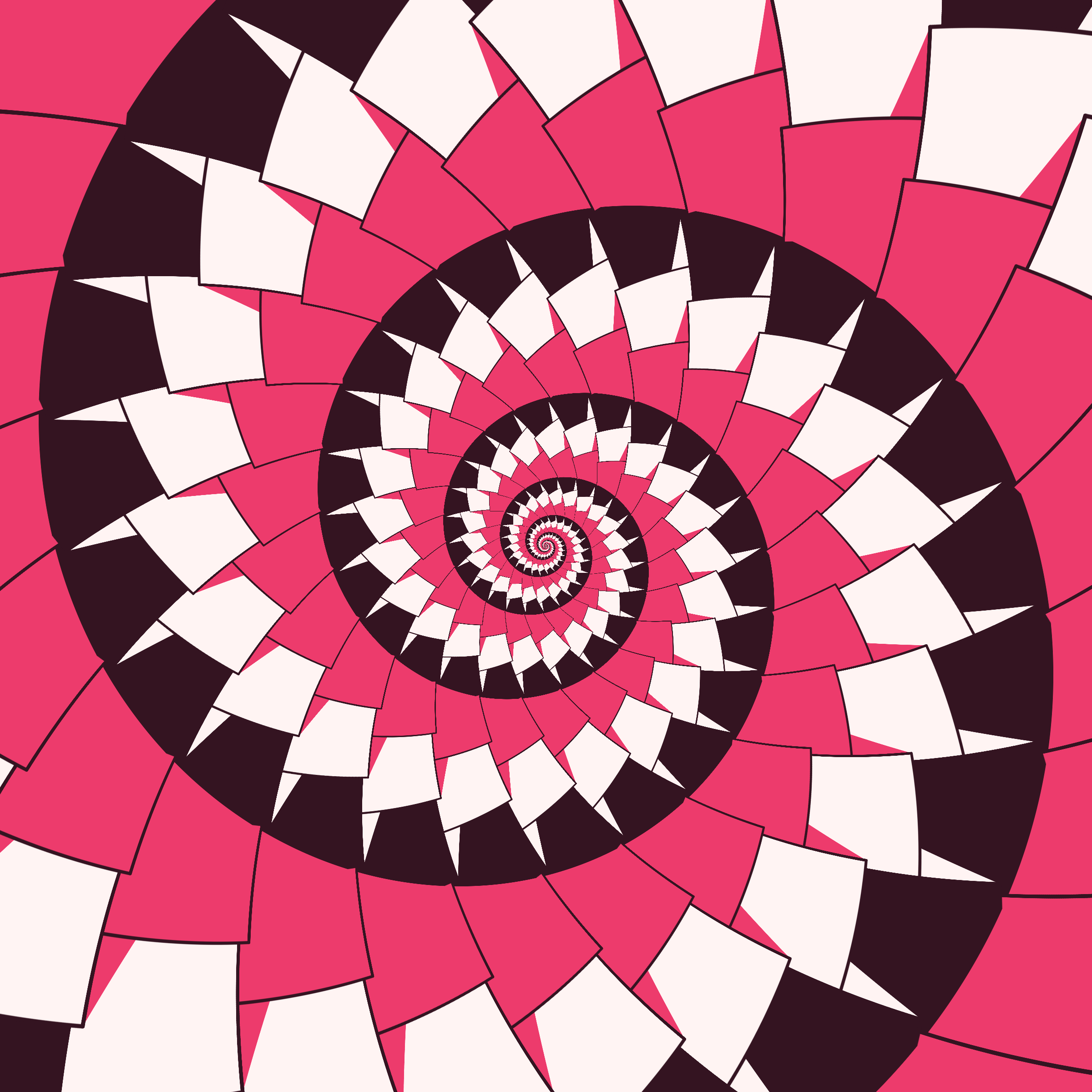 Escher-style tiling of a plane, gone wrong. Each image spins hash-driven colors, shapes, and symmetries into infinity. Fly through the spiral as it morphs between beauty and madness. Keys: F = Fly through/back, D = Distort on/off, Esc = Stop, S = Save image.