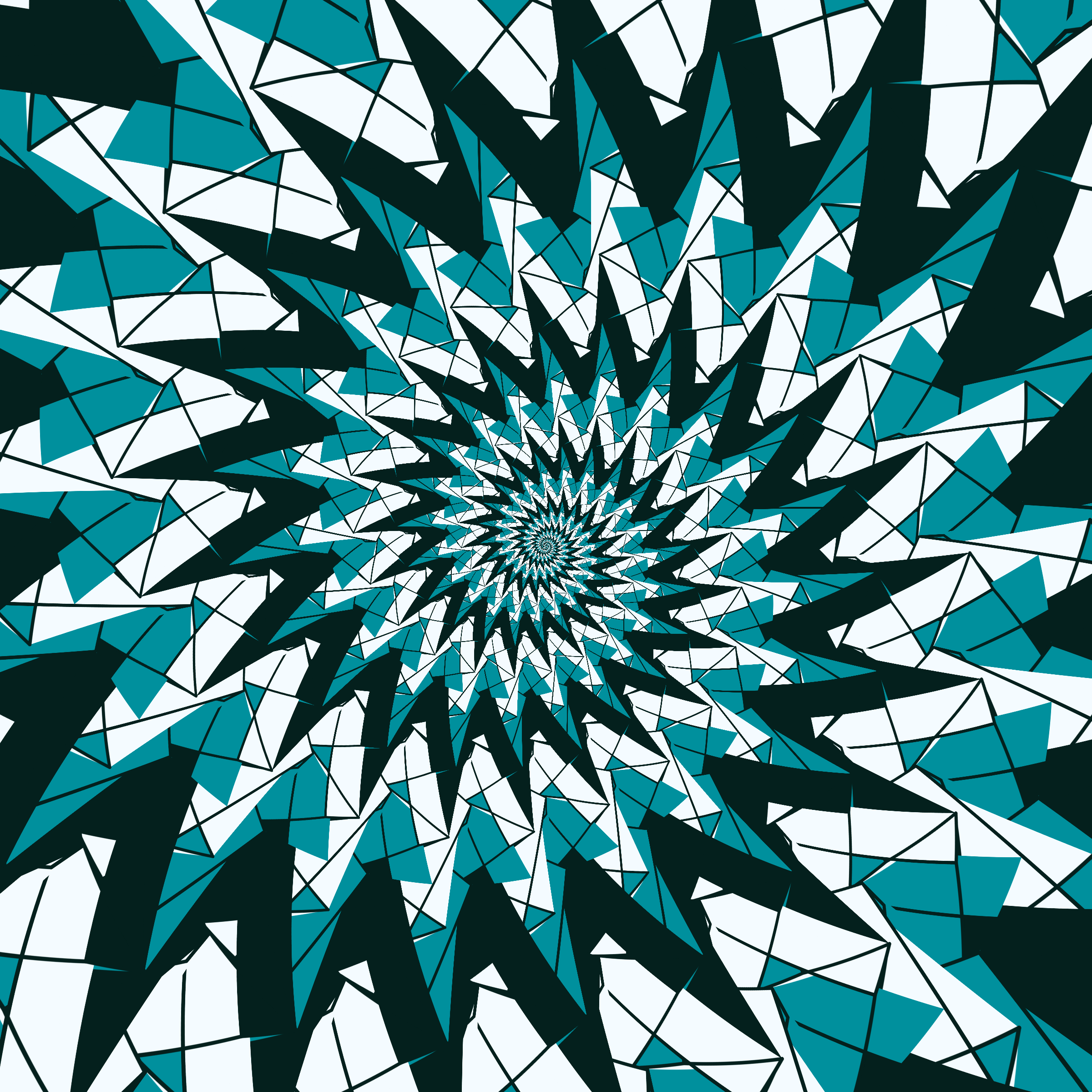 Escher-style tiling of a plane, gone wrong. Each image spins hash-driven colors, shapes, and symmetries into infinity. Fly through the spiral as it morphs between beauty and madness. Keys: F = Fly through/back, D = Distort on/off, Esc = Stop, S = Save image.