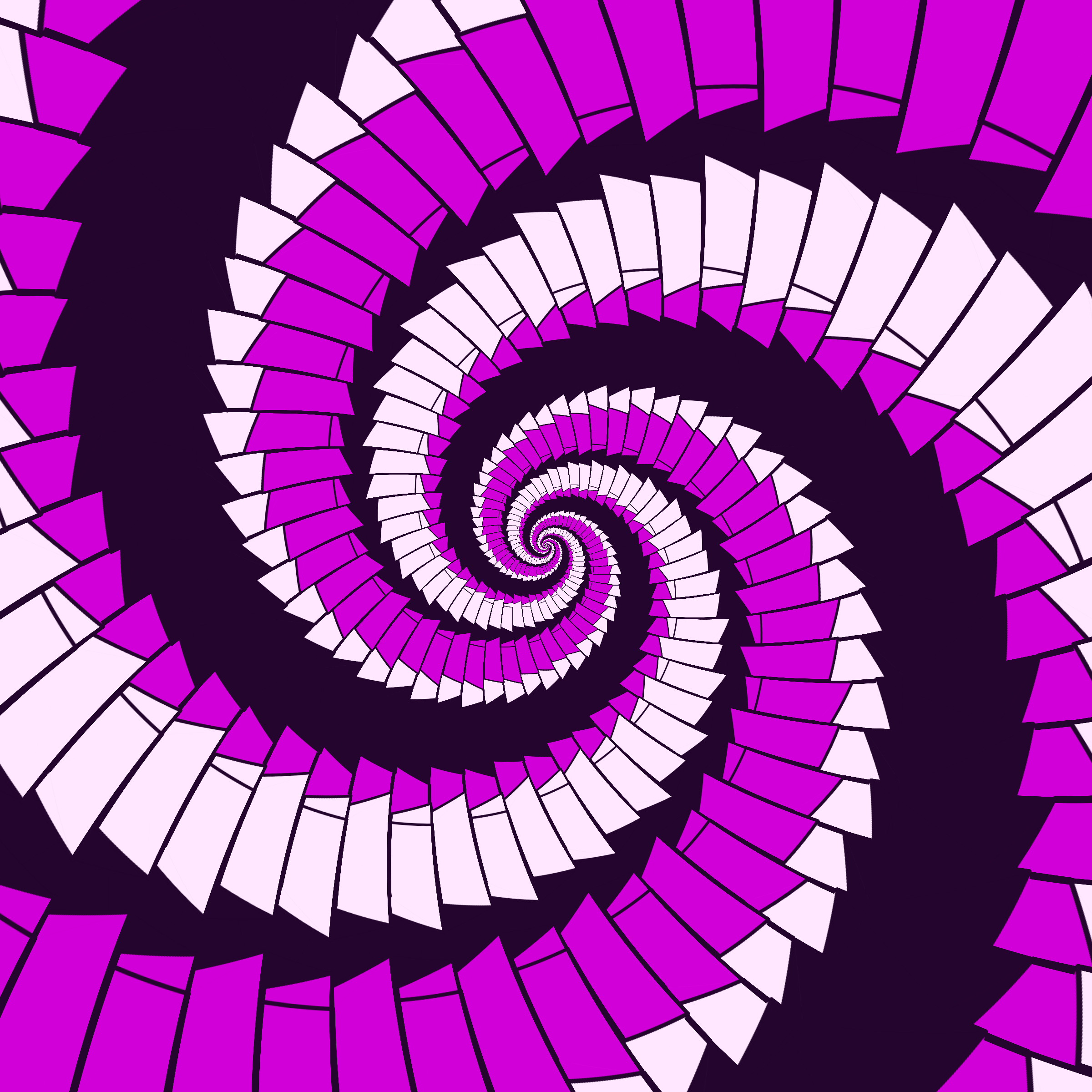 Escher-style tiling of a plane, gone wrong. Each image spins hash-driven colors, shapes, and symmetries into infinity. Fly through the spiral as it morphs between beauty and madness. Keys: F = Fly through/back, D = Distort on/off, Esc = Stop, S = Save image.