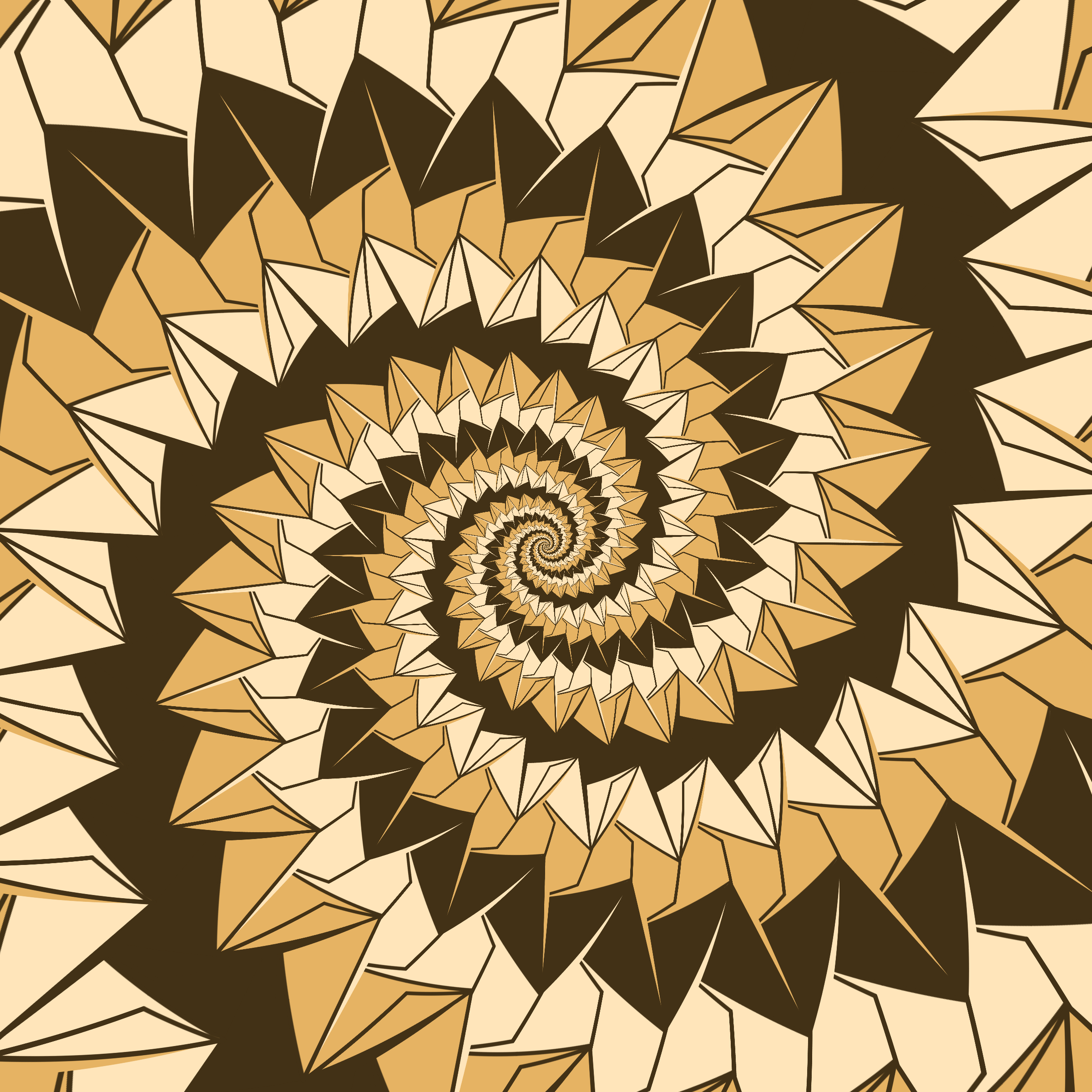 Escher-style tiling of a plane, gone wrong. Each image spins hash-driven colors, shapes, and symmetries into infinity. Fly through the spiral as it morphs between beauty and madness. Keys: F = Fly through/back, D = Distort on/off, Esc = Stop, S = Save image.