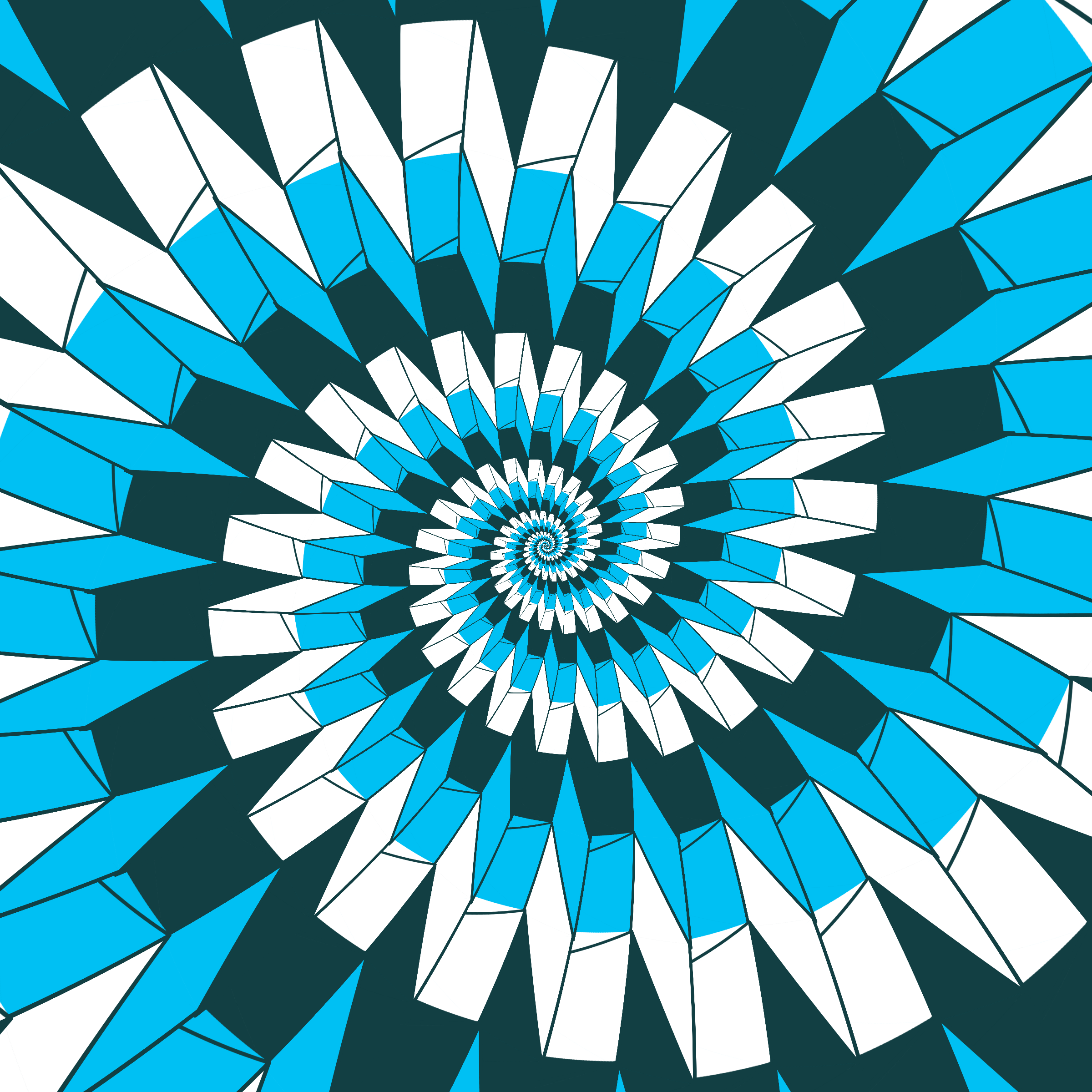 Escher-style tiling of a plane, gone wrong. Each image spins hash-driven colors, shapes, and symmetries into infinity. Fly through the spiral as it morphs between beauty and madness. Keys: F = Fly through/back, D = Distort on/off, Esc = Stop, S = Save image.