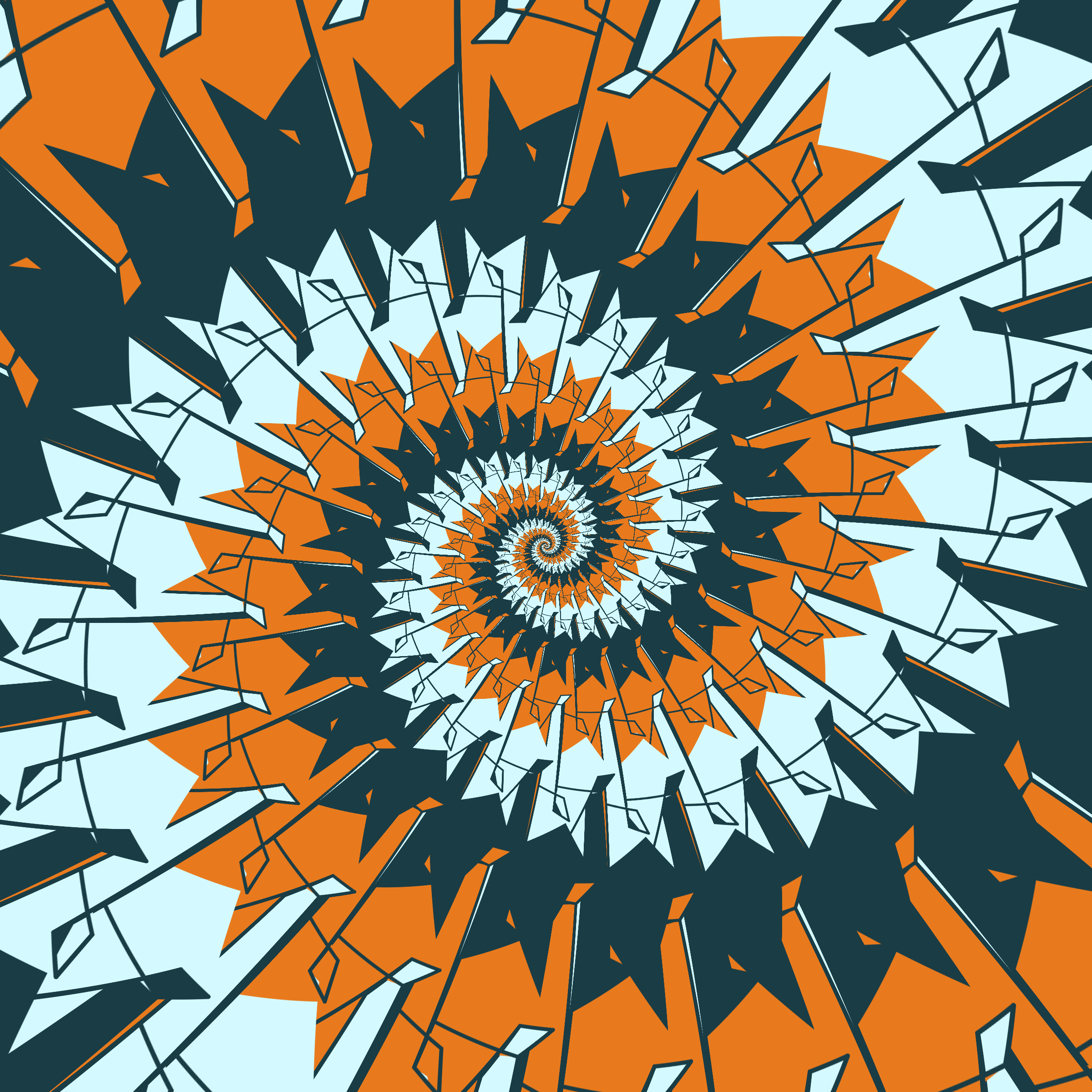Escher-style tiling of a plane, gone wrong. Each image spins hash-driven colors, shapes, and symmetries into infinity. Fly through the spiral as it morphs between beauty and madness. Keys: F = Fly through/back, D = Distort on/off, Esc = Stop, S = Save image.