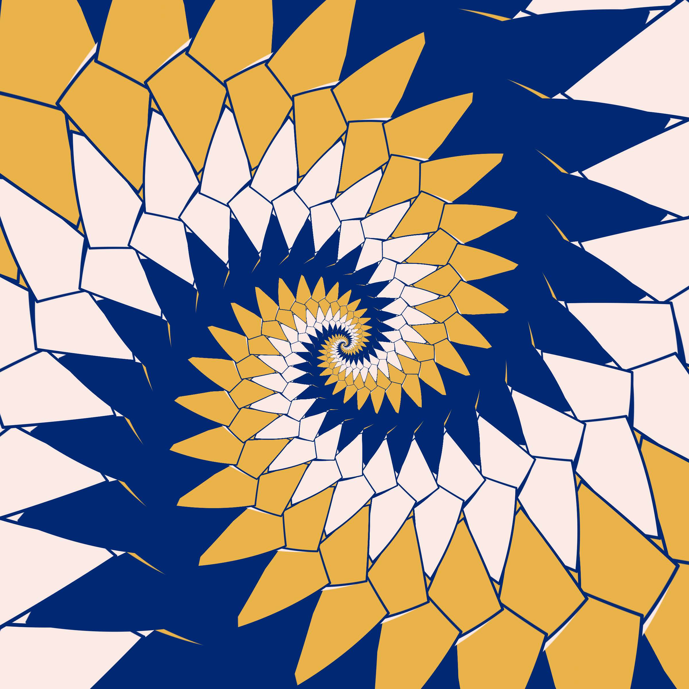 Escher-style tiling of a plane, gone wrong. Each image spins hash-driven colors, shapes, and symmetries into infinity. Fly through the spiral as it morphs between beauty and madness. Keys: F = Fly through/back, D = Distort on/off, Esc = Stop, S = Save image.