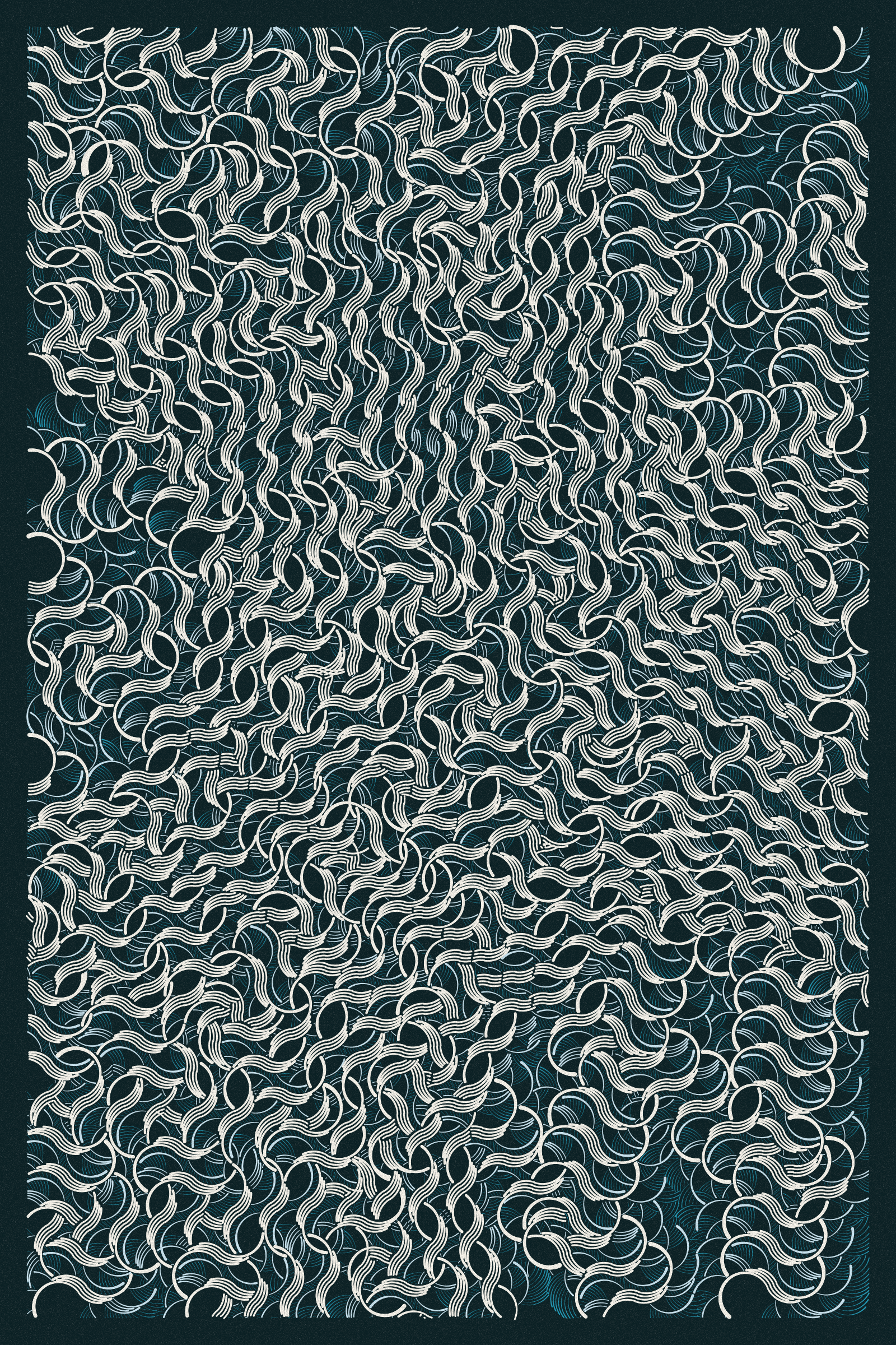 From a distance, an Intricada piece may look like intersecting circles, geometric patterns, confetti, a perspective design... When you get closer, you can see that these shapes are composed of multitudes of agent trajectories. Finally, if we get even closer, we can see that these trajectories are composed of points (several hundreds of thousands per output).