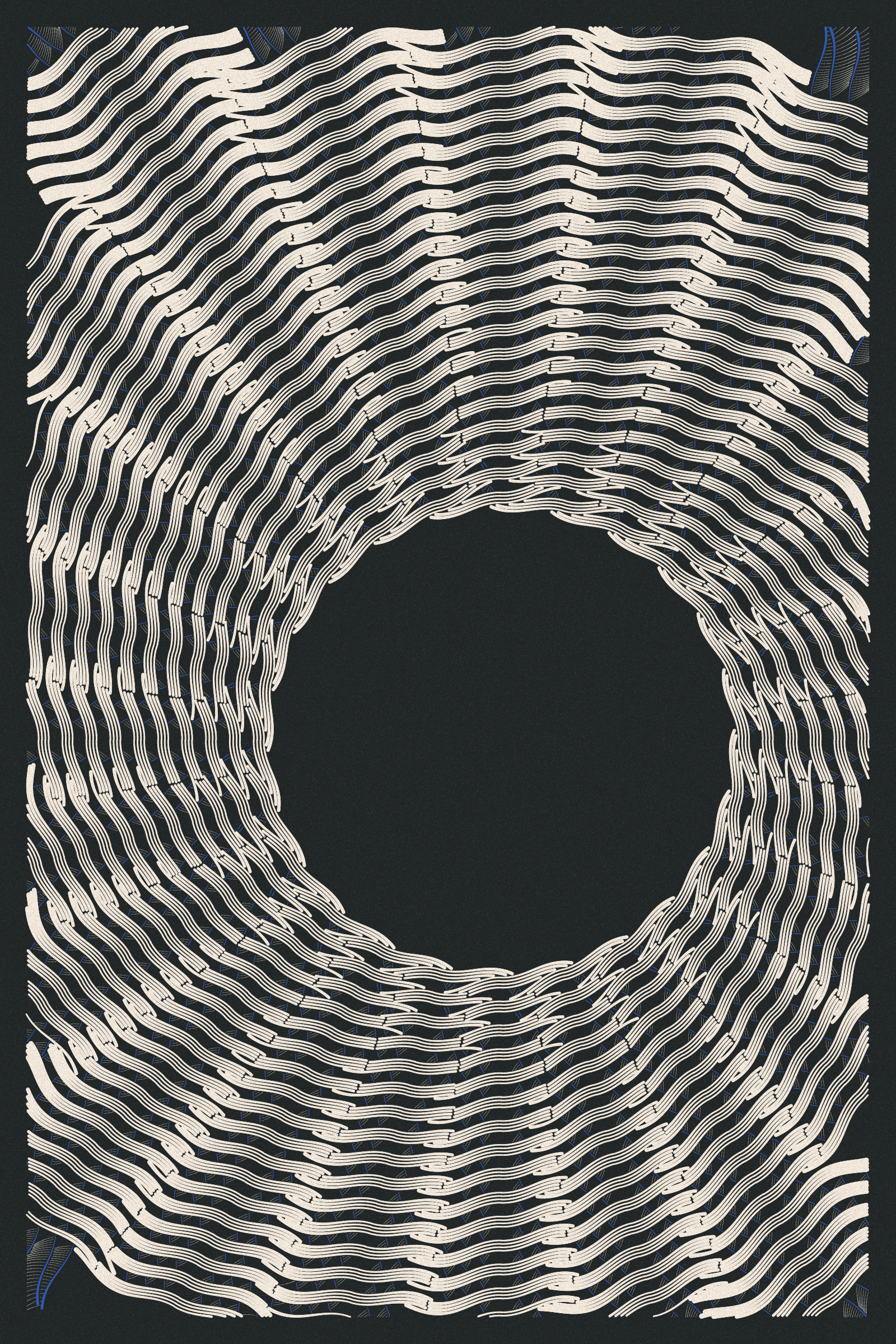From a distance, an Intricada piece may look like intersecting circles, geometric patterns, confetti, a perspective design... When you get closer, you can see that these shapes are composed of multitudes of agent trajectories. Finally, if we get even closer, we can see that these trajectories are composed of points (several hundreds of thousands per output).