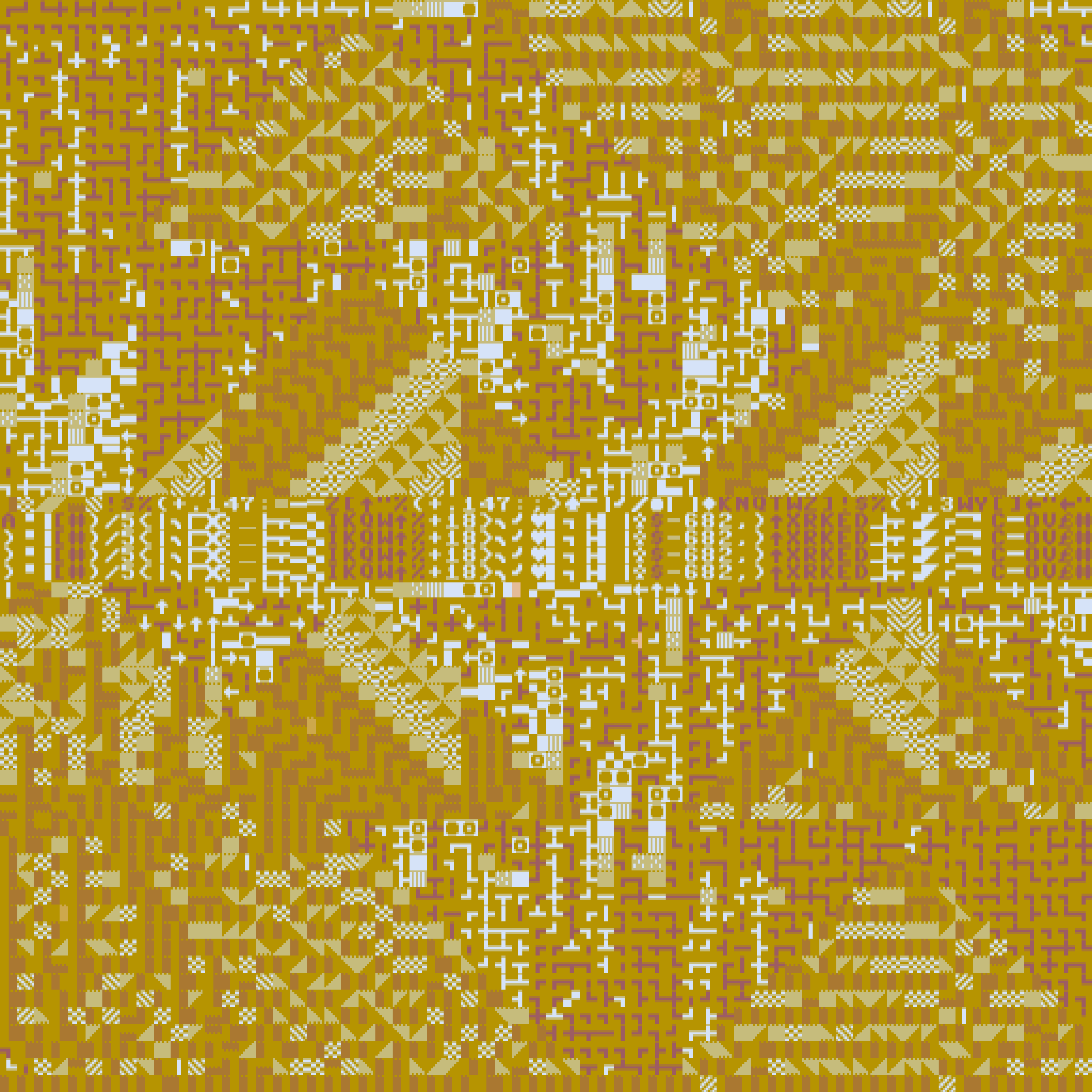 The visual elements are derived from the 80s computer era and are ought to evoke a warm feeling of completeness and simplicity. On a 64×64 grid a variety of glyphs find their home within the single cells, shaped by different algorithms and placed into this world by one of the many color palettes. In total there are 64 custom color palettes with the ability to switch to a more 'rare' inverted configuration.
