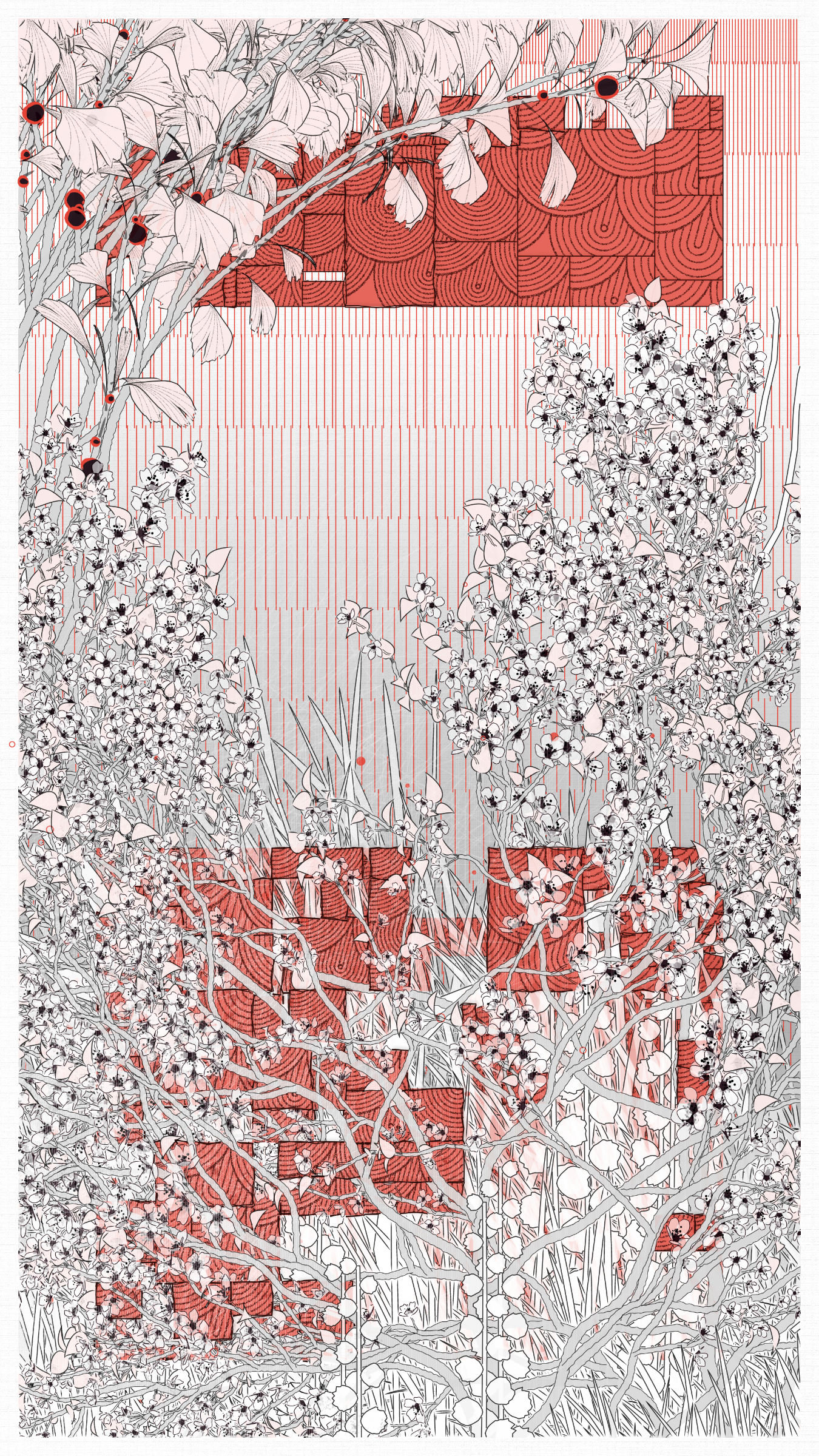 How can one create a work inspired by a city where one has never set foot? Moreover, a place on the other side of the world, whose history and cultural richness are of such dizzying density? I quickly realized that my work could only be imagined, dreamed, imbued with my Western culture, tinged with my distant prejudices. I worked with a visual approach above all, around a few chosen colors, representative tree species, and some clichéd symbols: for example, the composition is organized around 3 abstract shapes, including the circle, directly inspired by the rising sun on the flag, the rectangular shape of a kakemono, or a cityscape.